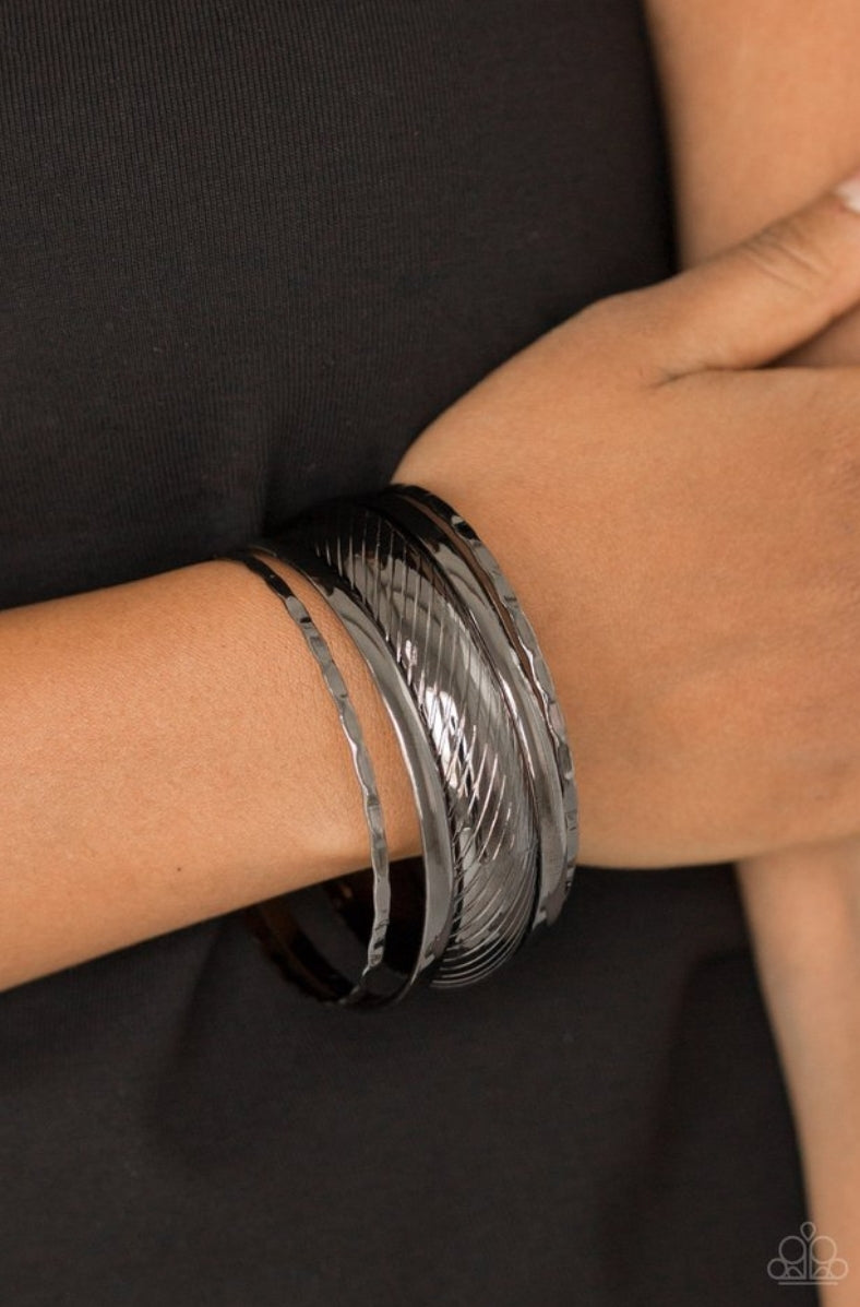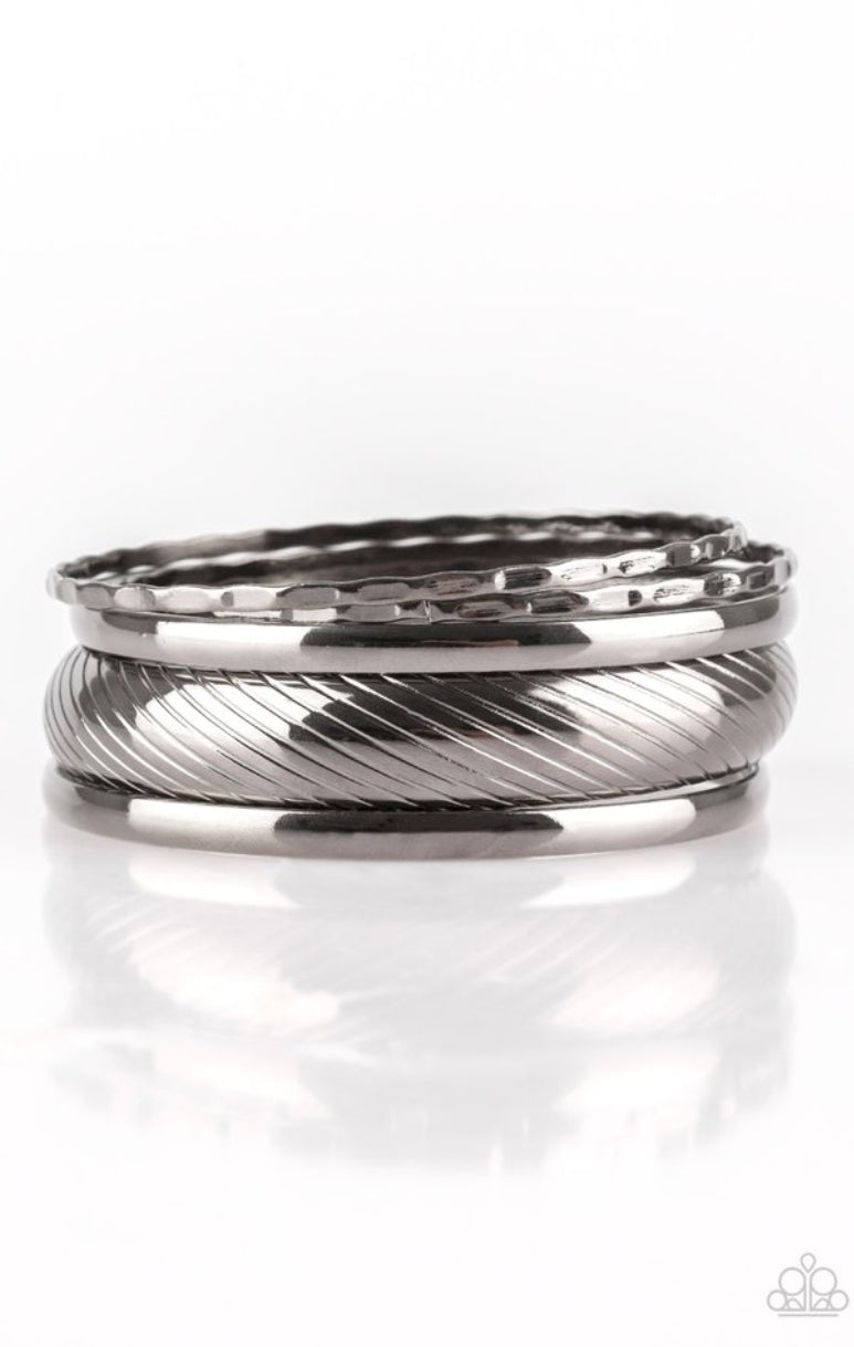 Featuring serrated and smooth surfaces, mismatched gunmetal bangles stack across the wrist for a casual look.