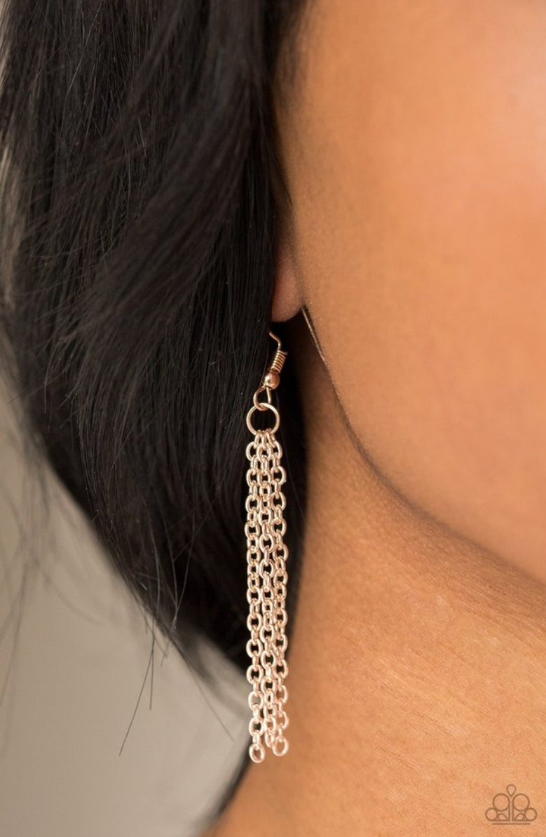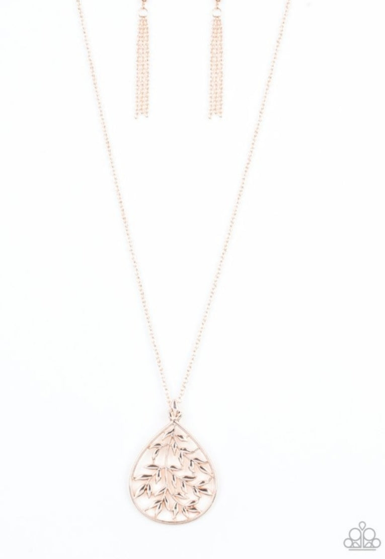 Leafy rose gold branches fan out across a glistening rose gold teardrop frame, creating a whimsical pendant at the bottom of a lengthened rose gold chain. Features an adjustable clasp closure.
