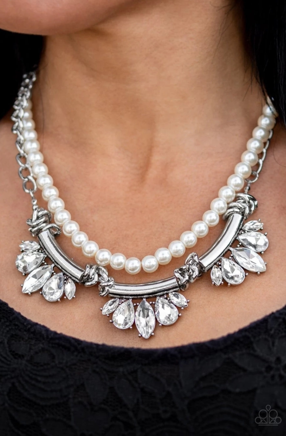 A classic strand of white pearls and dramatic silvery chain drape below the collar. Infused with heavy metal accents, teardrop and marquise cut white rhinestone frames connect into a show-stopping fringe. Features an adjustable clasp closure.