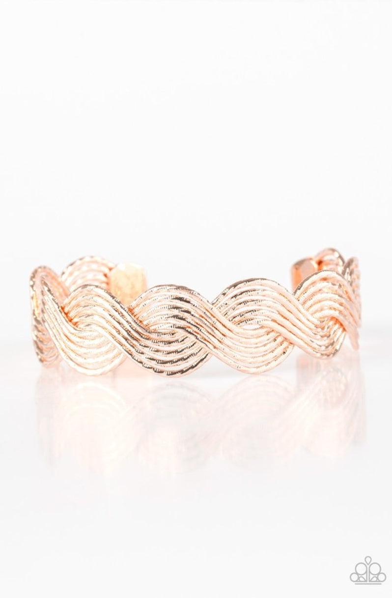 Delicately hammered in shimmery detail, glistening rose gold wires braid into a brilliant cuff around the wrist for a casual look.