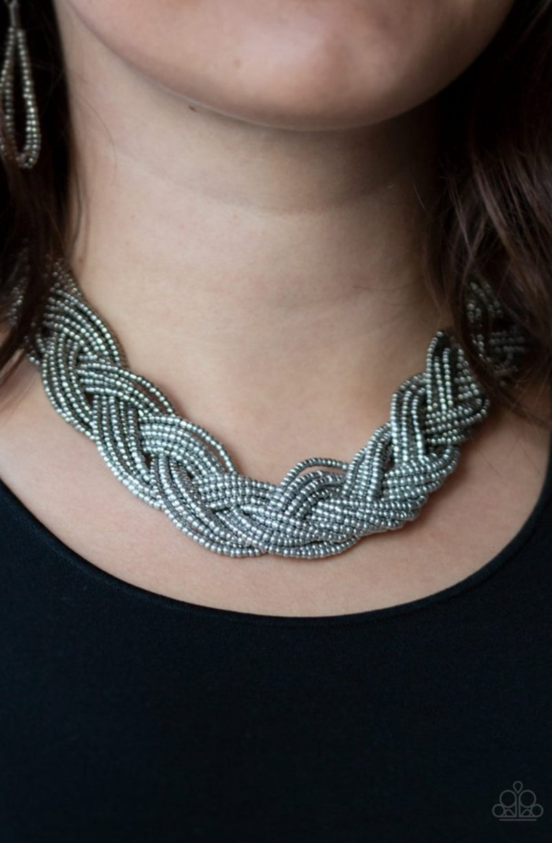 Strands of gunmetal seed beads create an indigenous braid below the collar. The gunmetal seed beads gradually morph into metallic silver beads at the center for a chic contrasting look. Features an adjustable clasp closure.