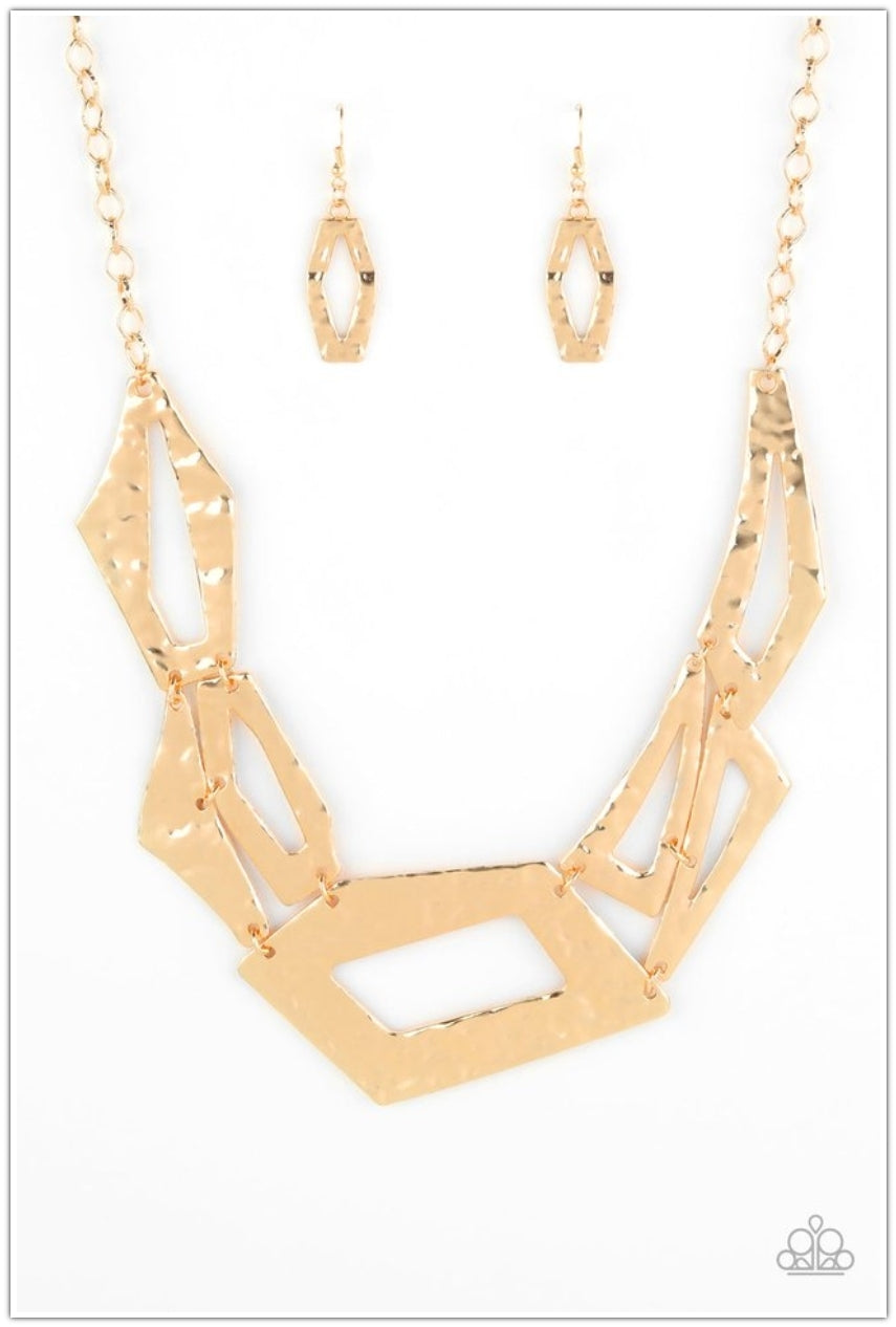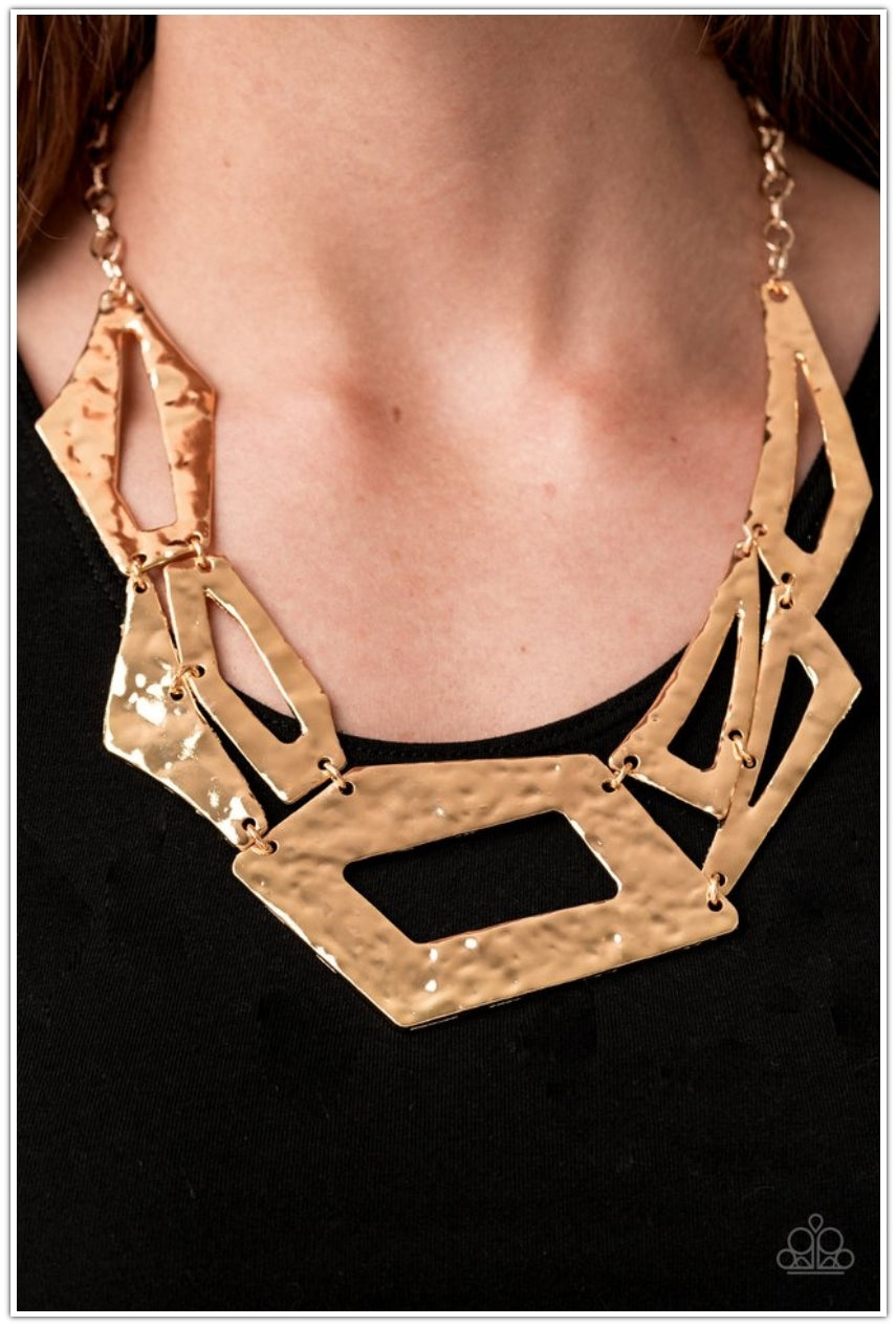Attached to an edgy gold chain, hammered gold plates featuring asymmetrical shapes abstractly link below the collar for a knockout look. Features an adjustable clasp closure.