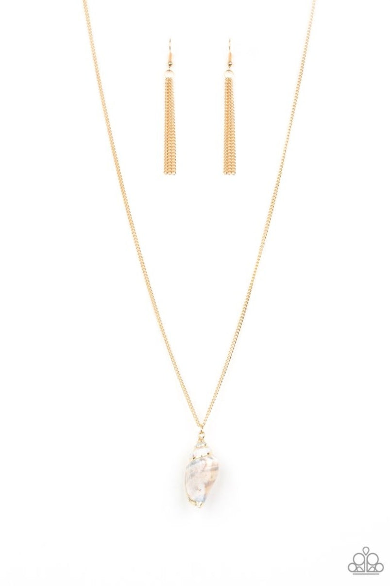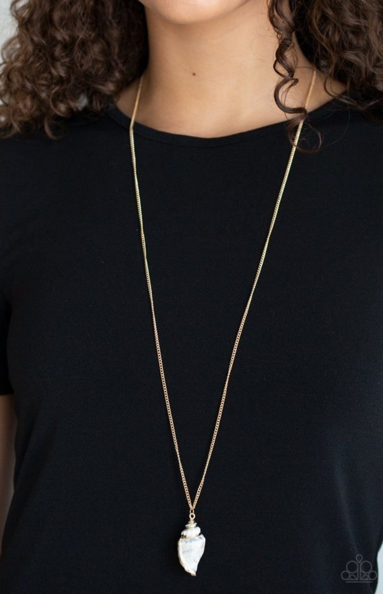 Bordered in a glistening gold finish, an iridescent seashell swings from the bottom of a lengthened gold chain for a summery flair. Features an adjustable clasp closure.