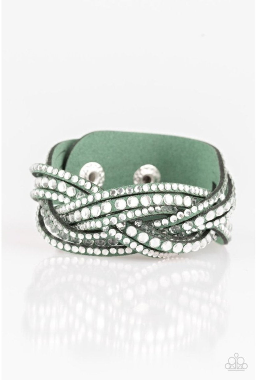 Varying in size, glassy white rhinestones are encrusted along interwoven green suede bands, creating blinding shimmer across the wrist. Features an adjustable snap closure.