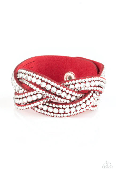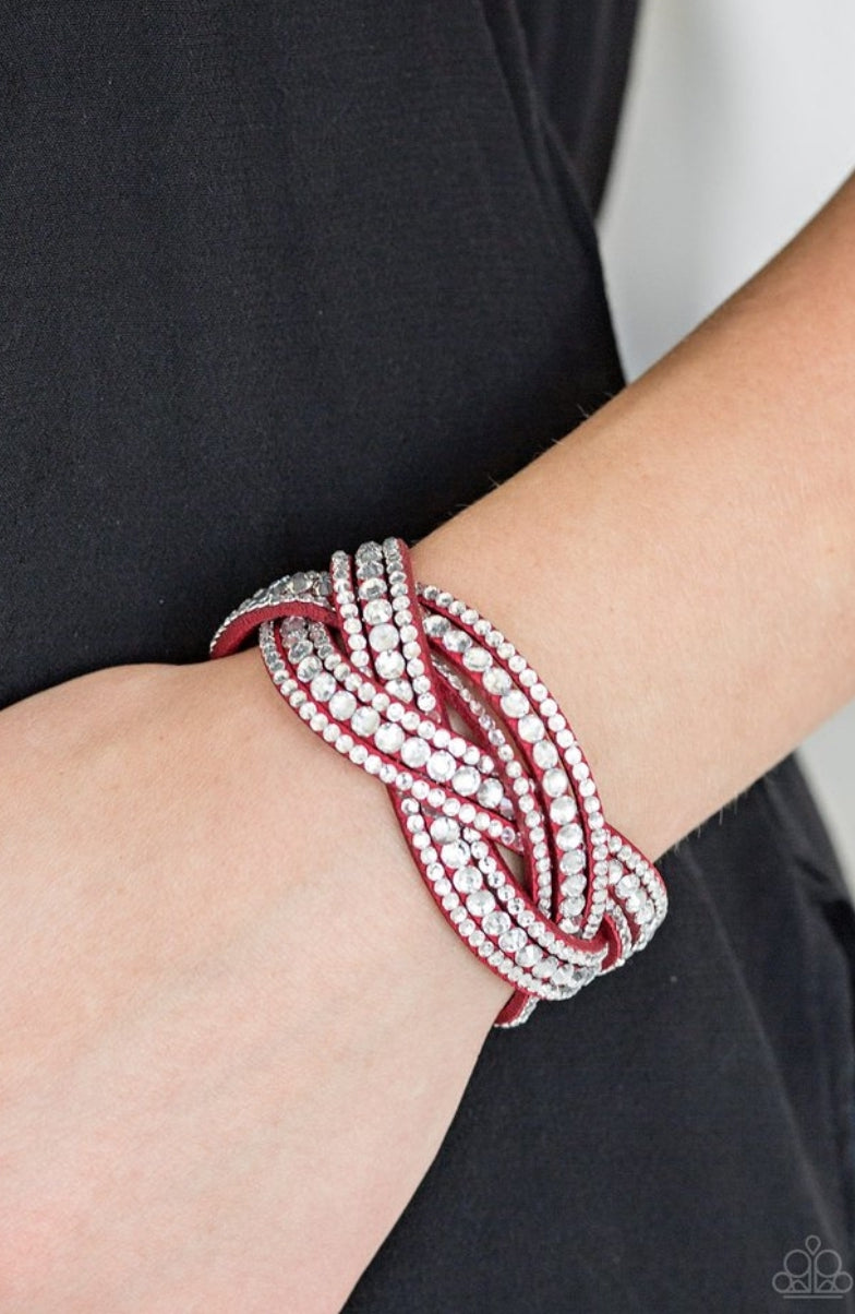 Varying in size, glassy white rhinestones are encrusted along interwoven red suede bands, creating blinding shimmer across the wrist. Features an adjustable snap closure.