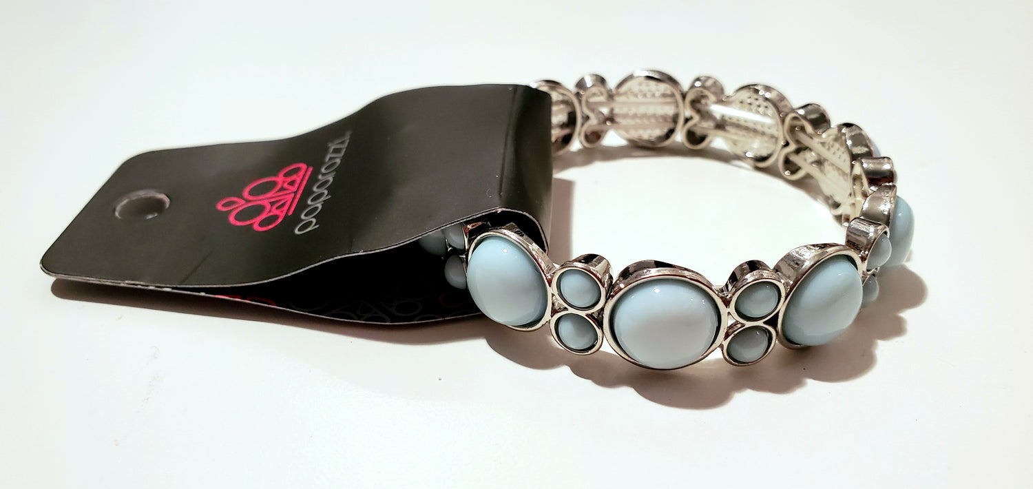 Clustered blue beaded frames are threaded along stretchy bands around the wrist, creating a bubbly look.