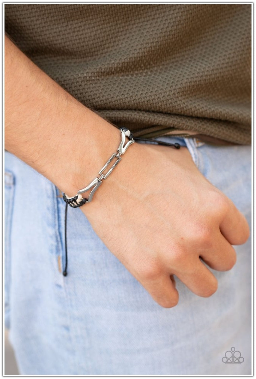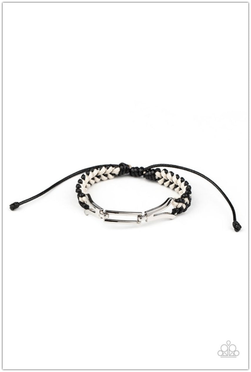 Braided strands of black and white twine-like cording knot around interlocking silver frames, creating an edgy urban centerpiece around the wrist. Features an adjustable sliding knot closure.