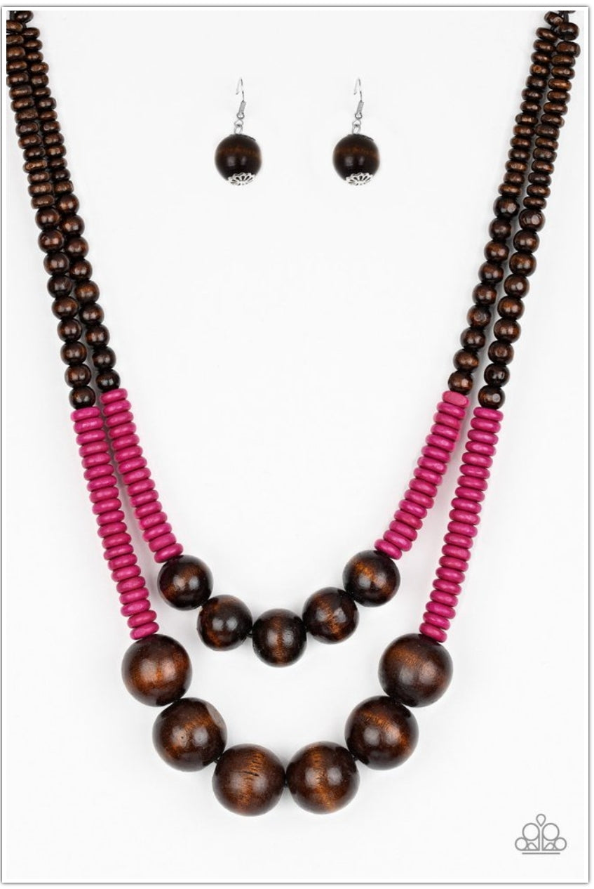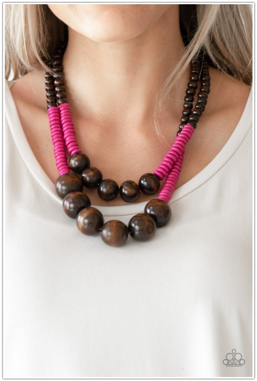 Earthy brown and vivacious pink wooden beads and discs are threaded along shiny strands of brown cording, creating colorful layers. Features a button loop closure.