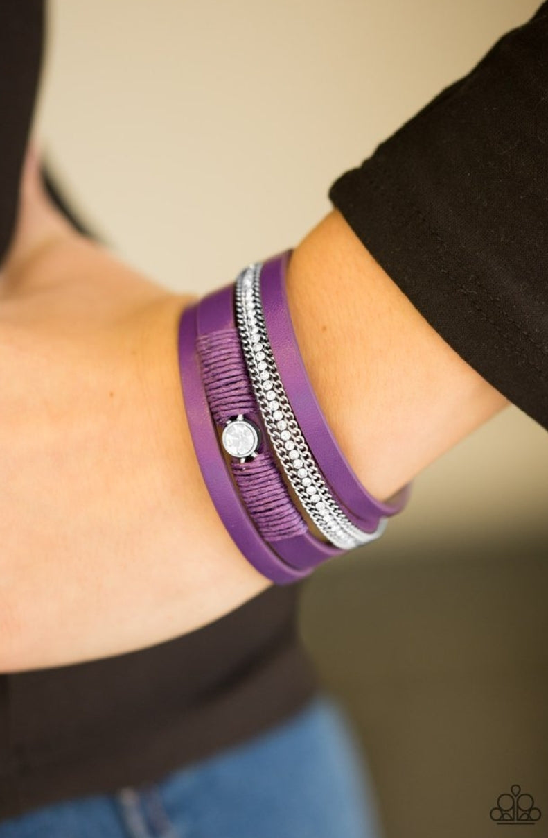 Vivacious purple leather strands layer across the wrist. Infused with silver chain and white rhinestone accents, purple cording knots around a leather strand, securing a solitaire white rhinestone in place for a whimsical finish. Features an adjustable clasp closure.