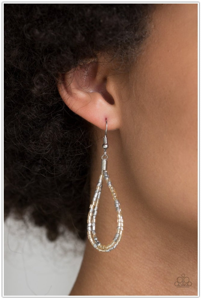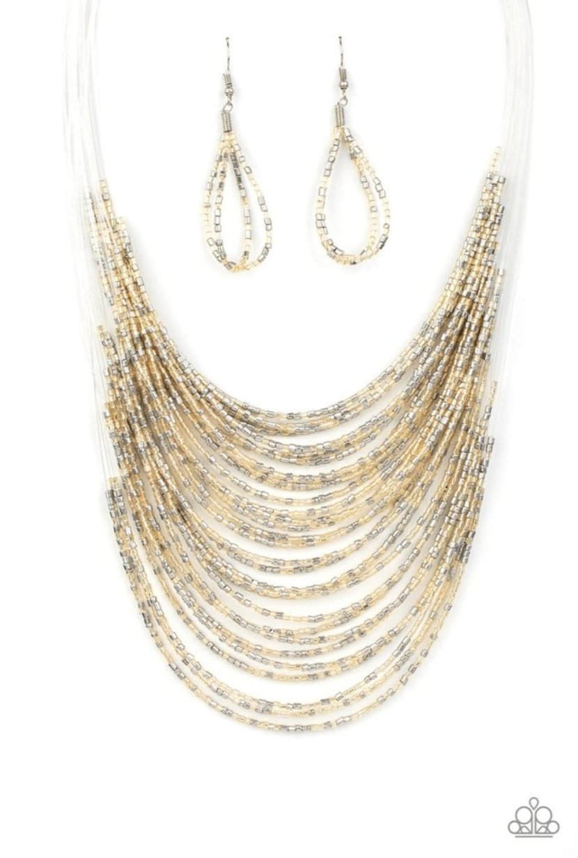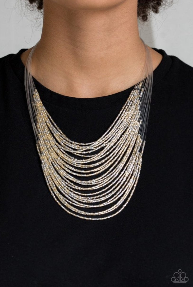 Strand after strand of metallic gold and silver seed beads fall together to create a bold statement piece. Features an adjustable clasp closure.