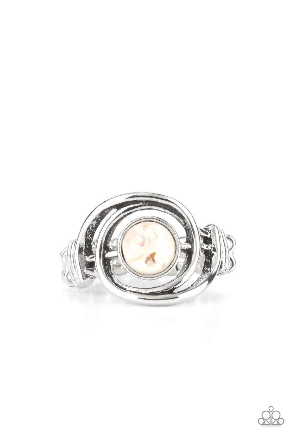 Glistening silver bars swirl around a glassy white bead flecked in iridescent shell, creating an ethereal centerpiece atop the finger. Features a dainty stretchy band atop the finger.