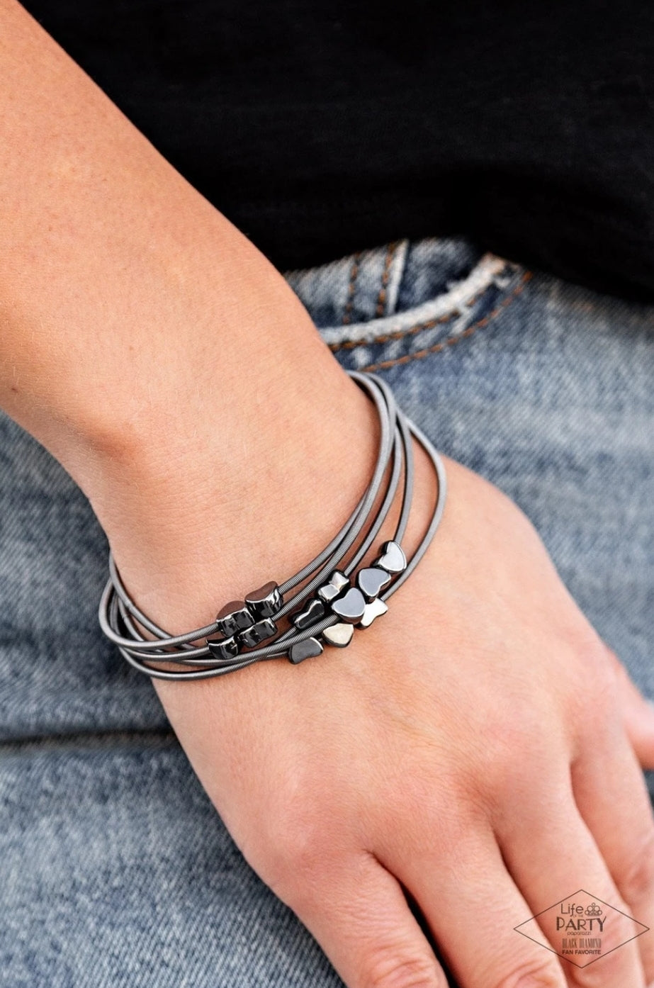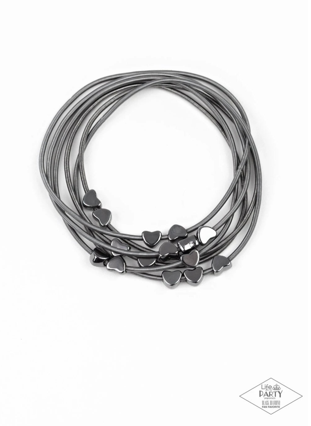 Dainty black hearts slide along interlocking stretchy spring-like wires, creating whimsical layers across the wrist.