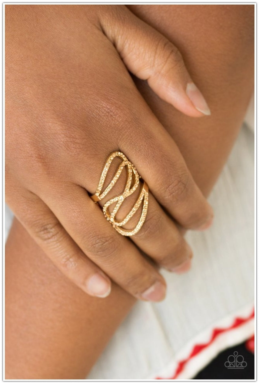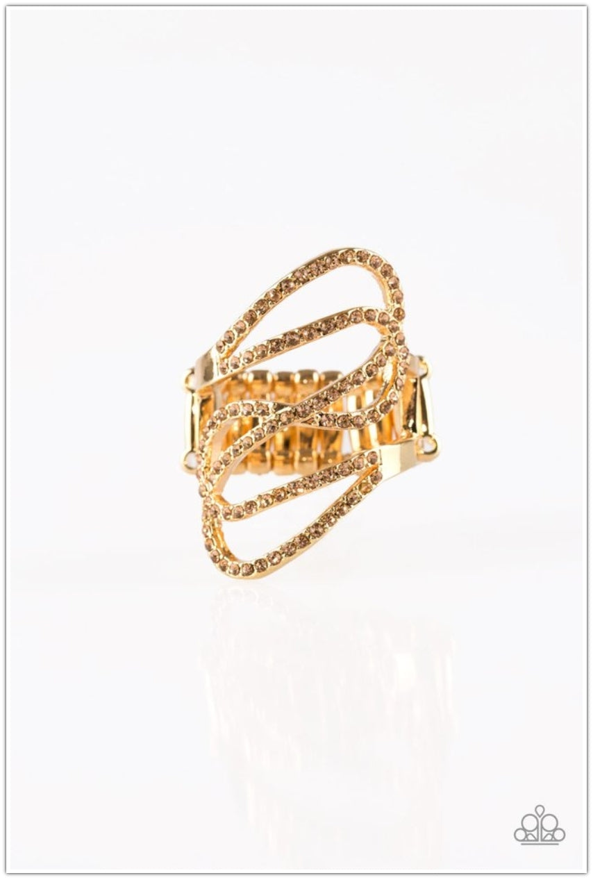 Encrusted in glittery peach rhinestones, sparkling gold ribbons swoop across the finger for a refined look. Features a stretchy band for a flexible fit.