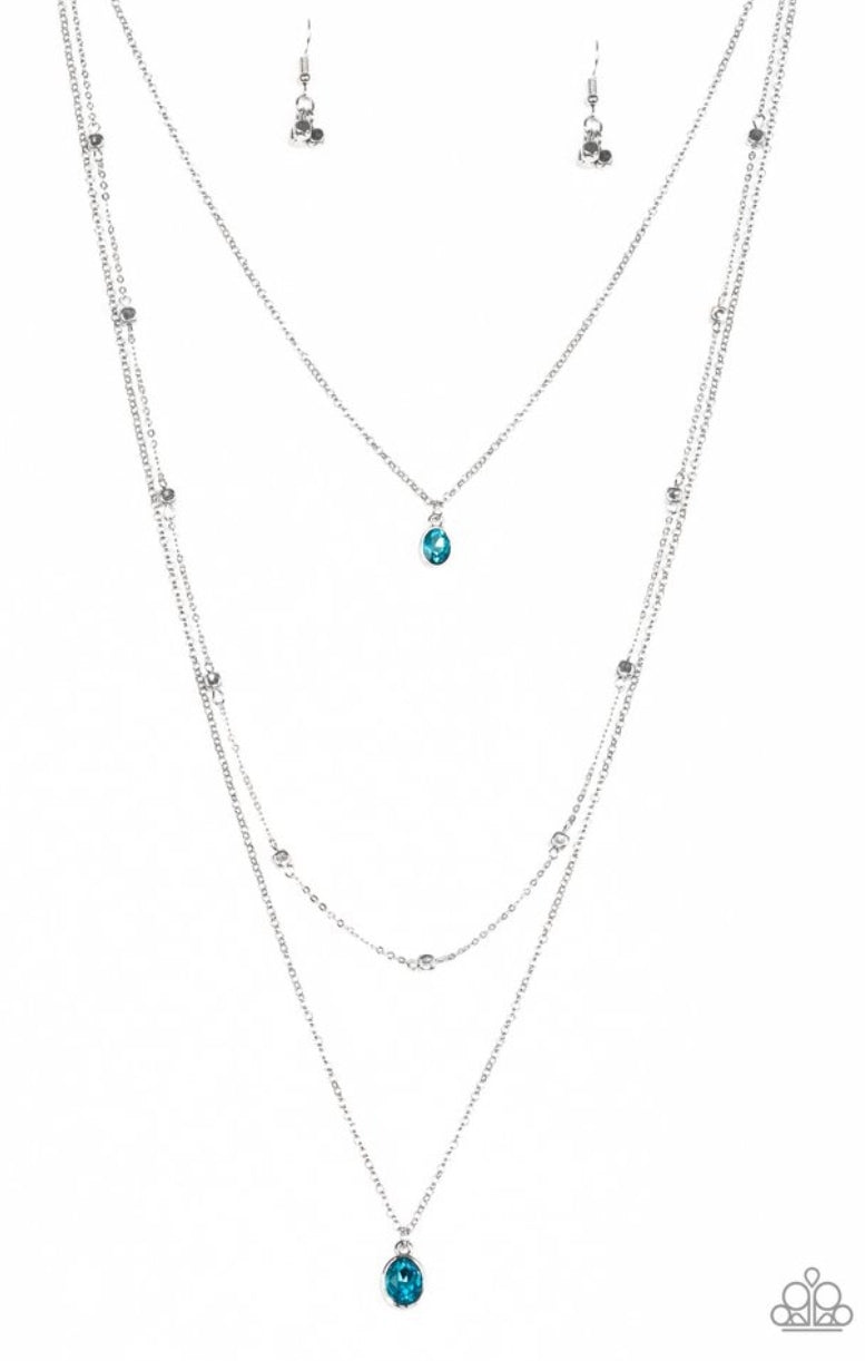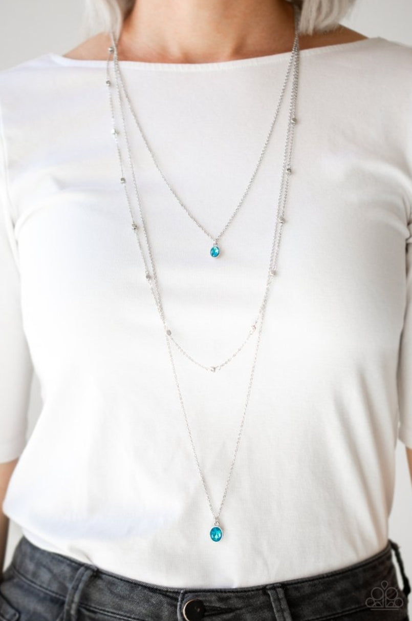 Three dainty silver chains layer down the chest. A glittery blue gem pendant swings from the uppermost chain, giving way to a shimmery silver chain embellished in glistening cube beading. Slightly larger in size, a matching blue gem pendant swings from the lowermost chain for a glamorous finish. Features an adjustable clasp closure.