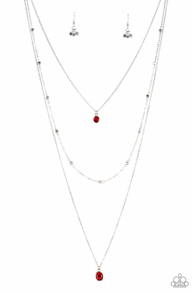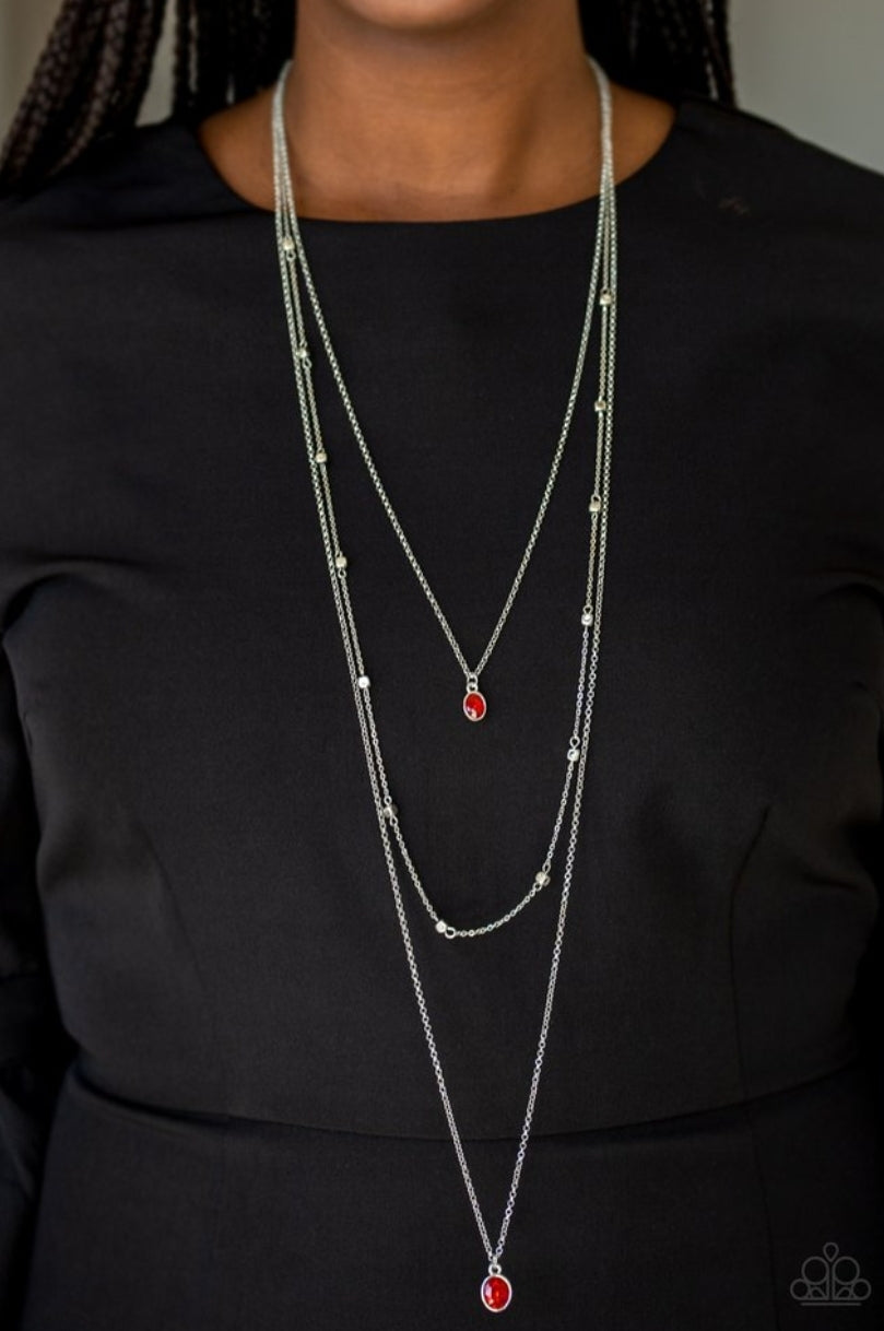Three dainty silver chains layer down the chest. A glittery red gem pendant swings from the uppermost chain, giving way to a shimmery silver chain embellished in glistening cube beading. Slightly larger in size, a matching red gem pendant swings from the lowermost chain for a glamorous finish. Features an adjustable clasp closure.