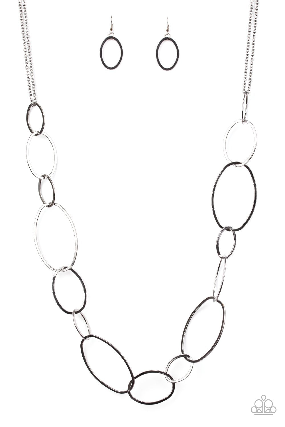 Swinging from doubled gunmetal chains, oversized asymmetrical hoops dramatically link across the chest for a refined industrial look. Features an adjustable clasp closure.