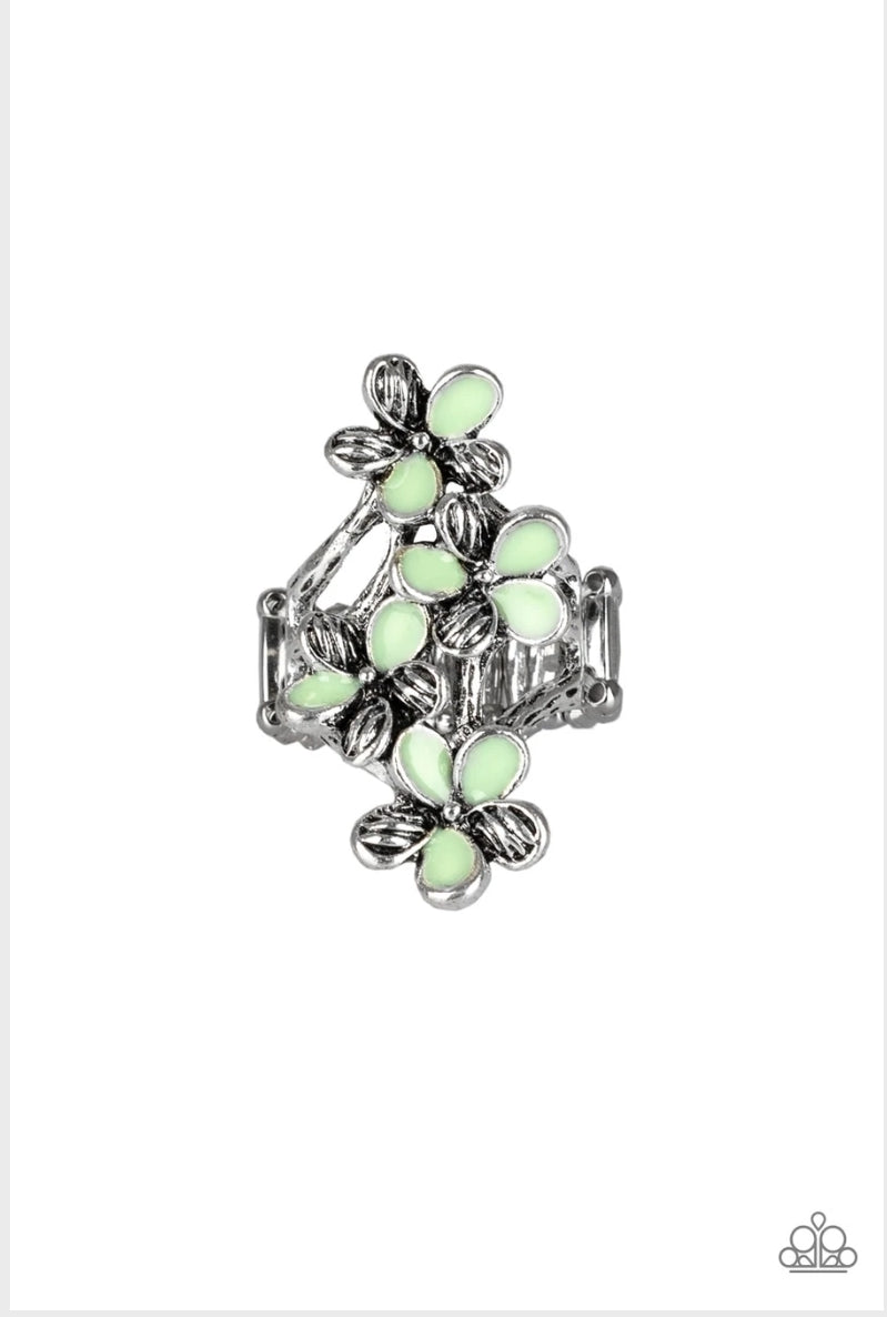 Featuring shiny green and textured silver petals, colorful flowers dance across the finger, coalescing into a whimsical frame atop the finger. Features a stretchy band for a flexible fit.