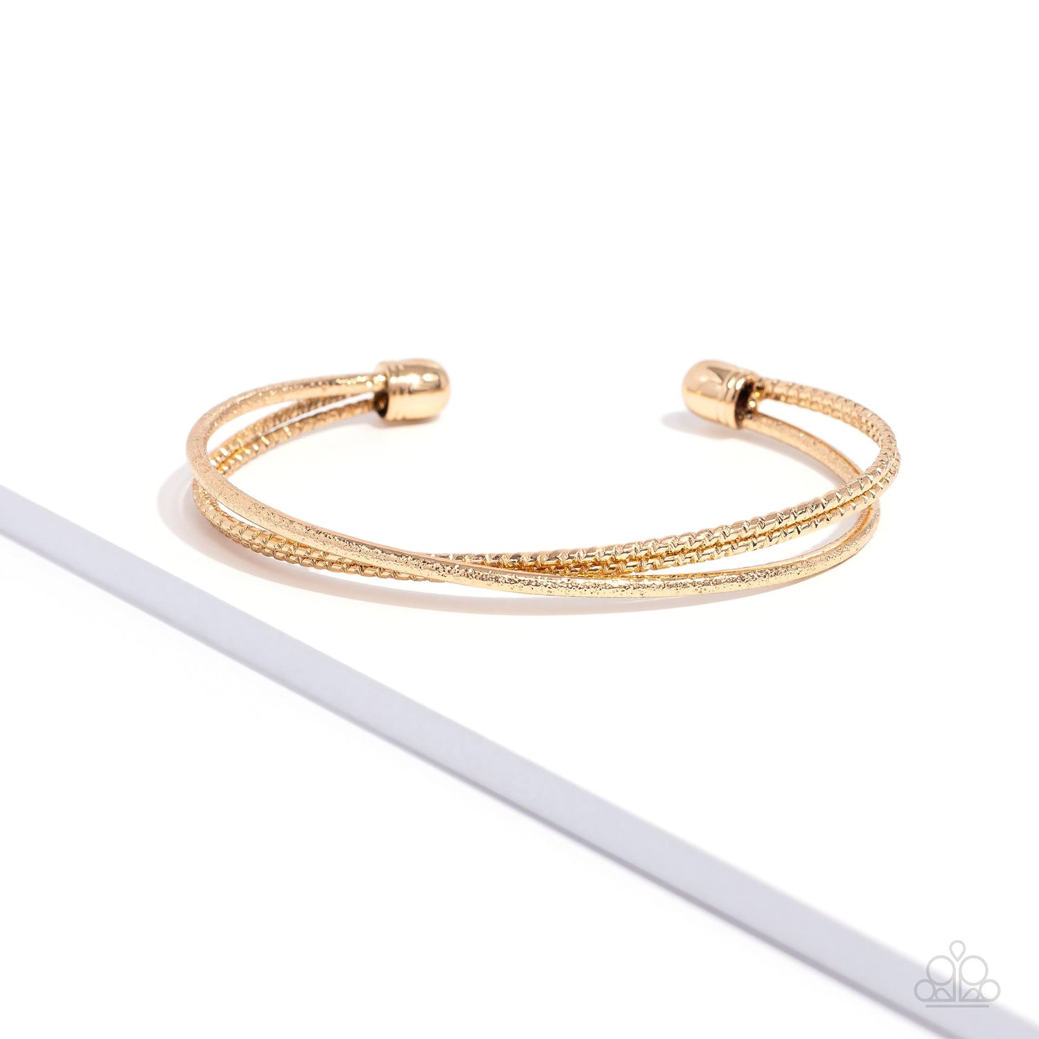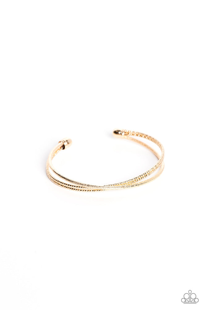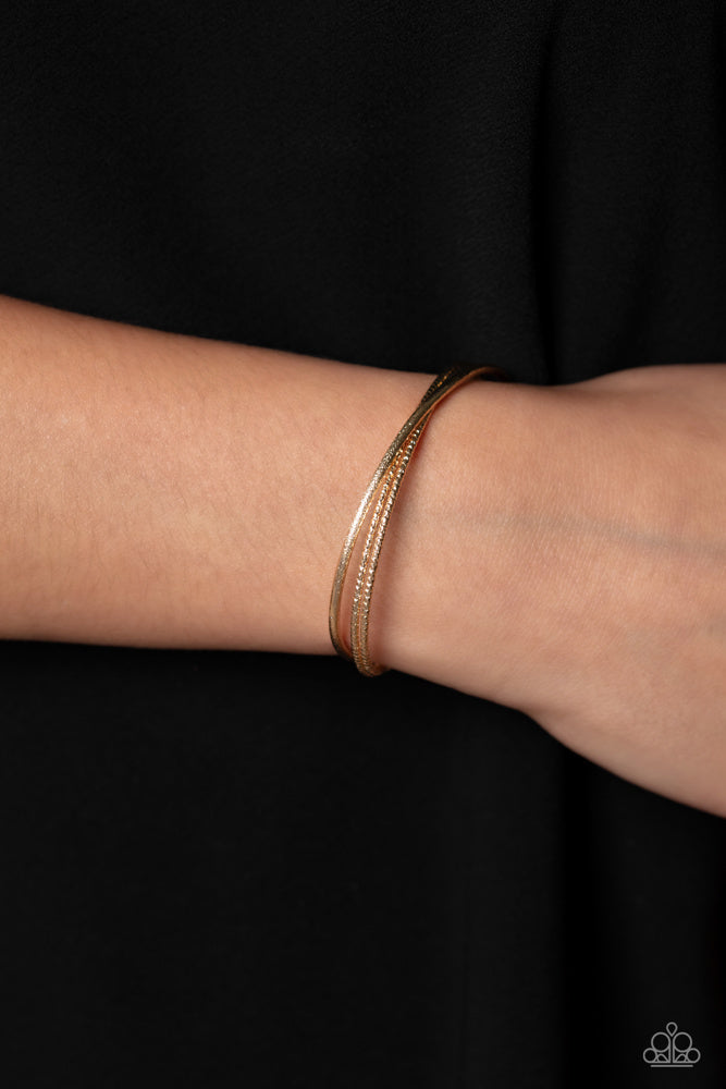 One strand of glittery gold and one double strand of textured gold crisscross across the wrist, coalescing into a versatile cuff around the wrist. Sold as one individual bracelet.