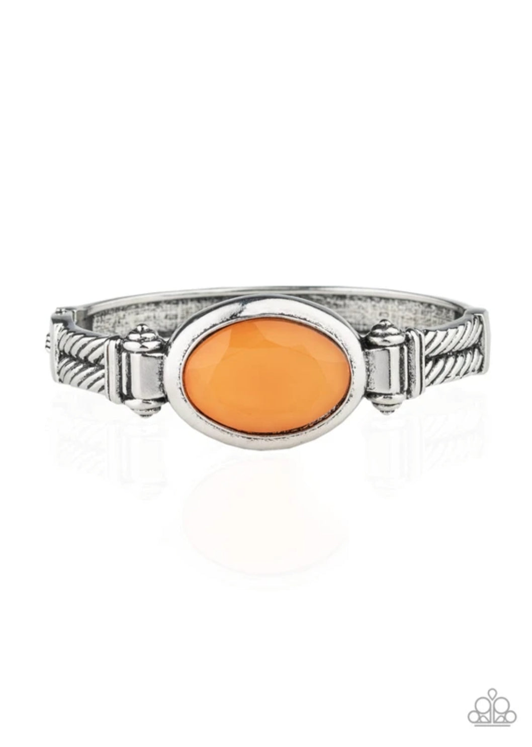 Round orange gem encased in a silver frame. Features a hinge style bracelet.