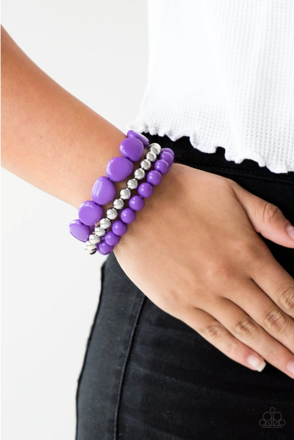 Varying in size, vivacious purple and glistening silver beads are threaded along stretchy bands, creating colorful layers across the wrist.