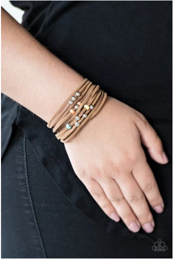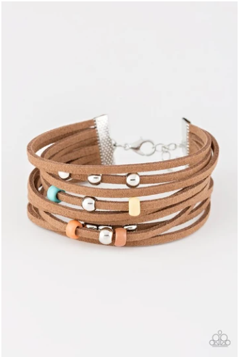 Dainty multicolored wooden beads and classic silver beads are threaded along strands of brown suede, creating colorful layers across the wrist. Features an adjustable clasp closure.