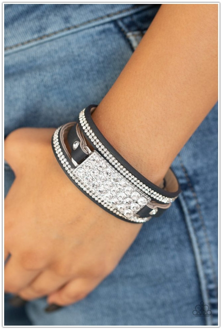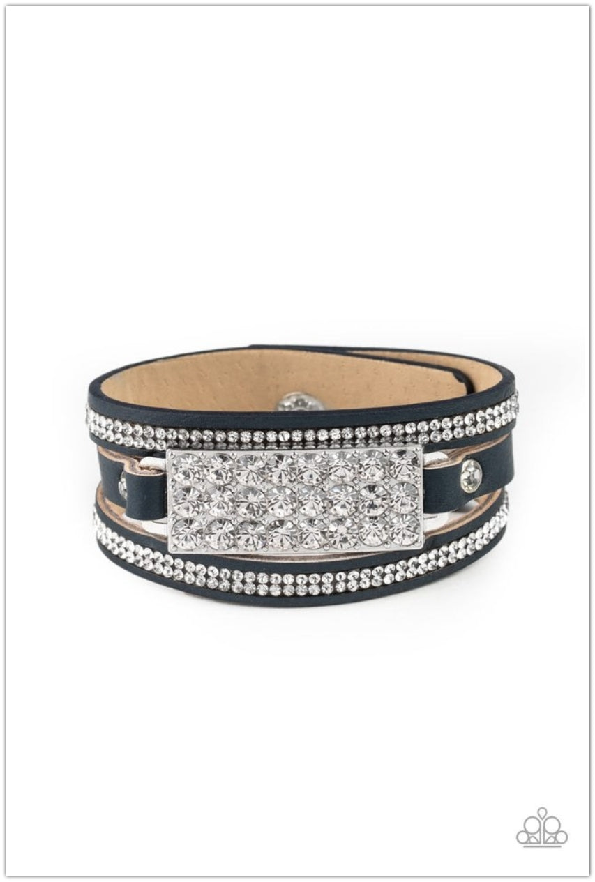 A thick blue leather band is spliced into three separate strands. Encrusted in rows of glassy white rhinestones, two glittery strands flank a blinding silver buckle encrusted in oversized white rhinestones for a glamorous finish. Features an adjustable snap closure.