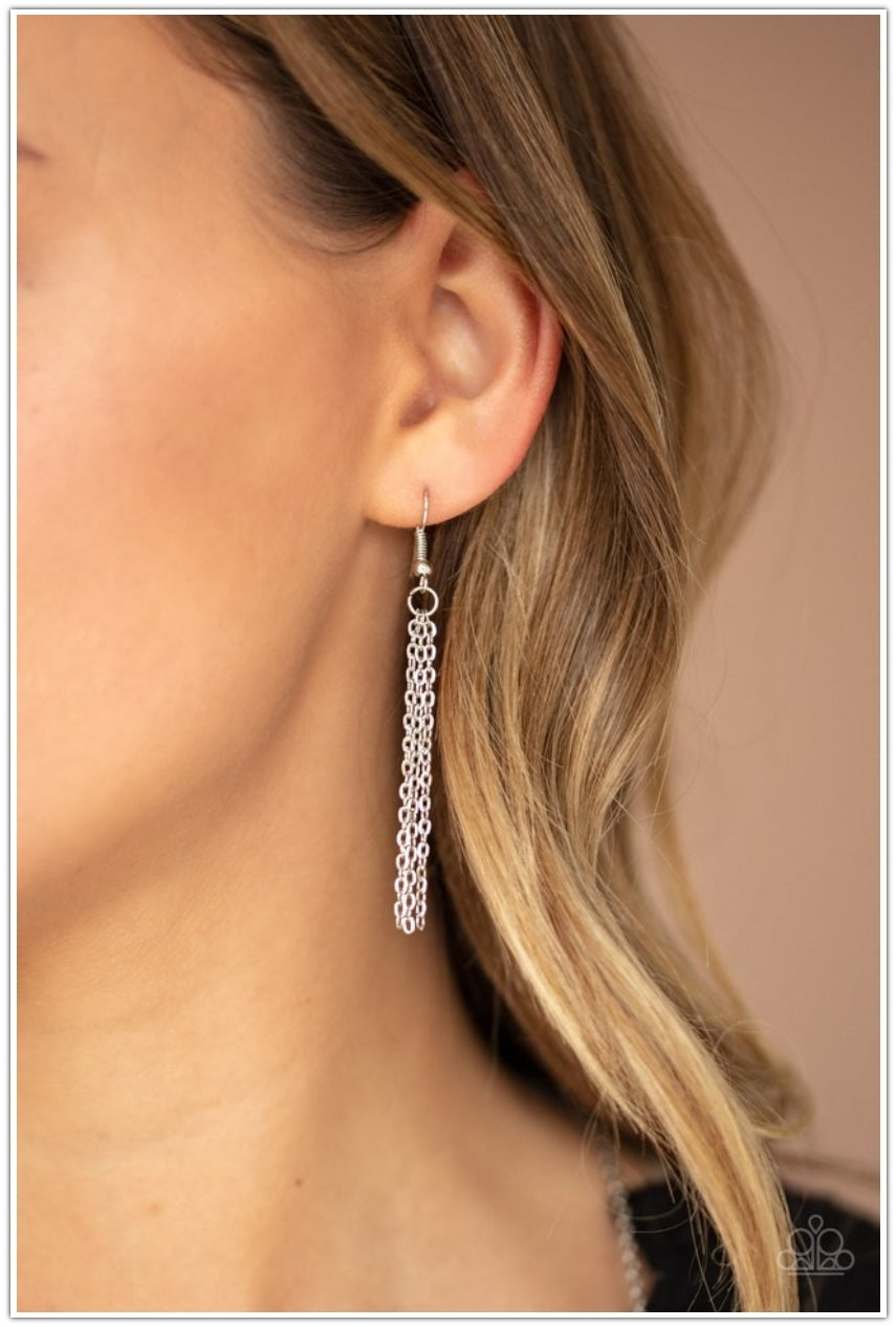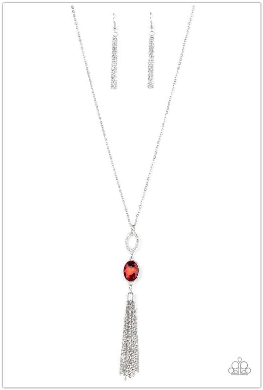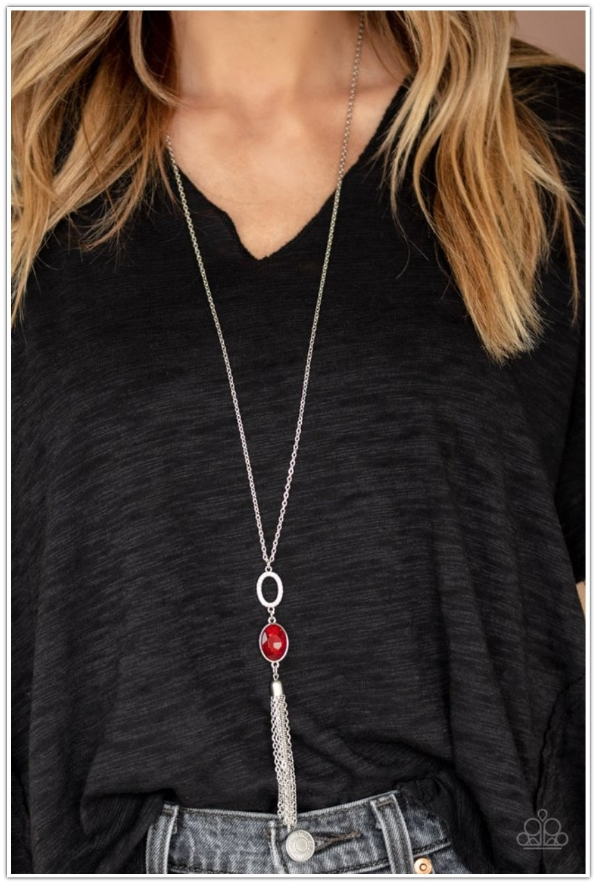 A white rhinestone encrusted ring, oval red rhinestone, and shimmery silver chain tassel dangles from the bottom of a lengthened silver chain, creating a glamorous statement. Features an adjustable clasp closure.