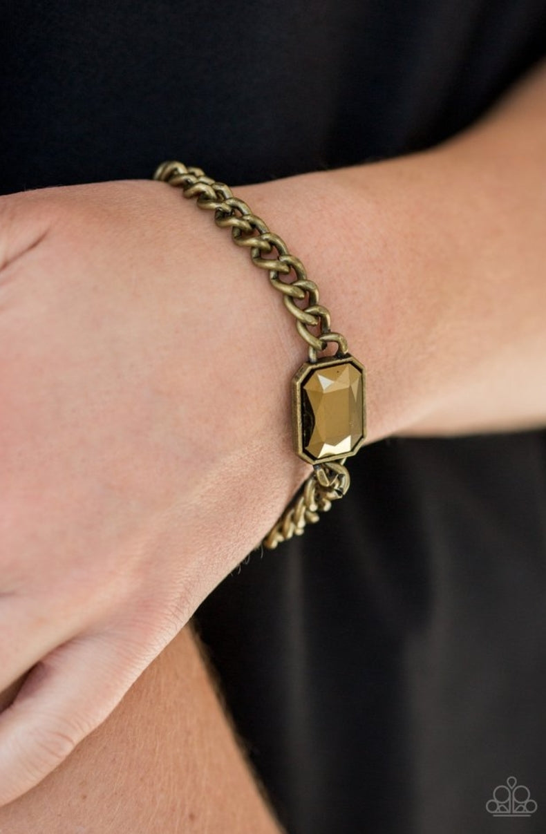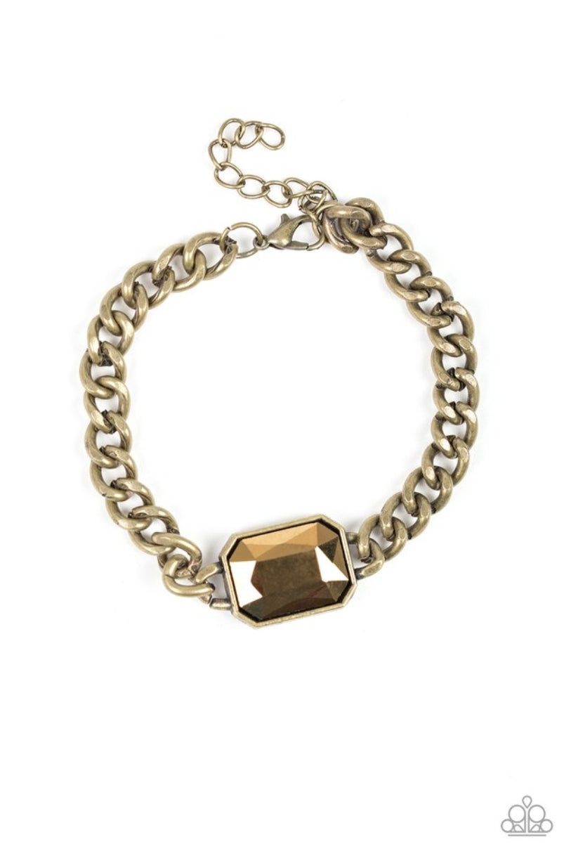 Featuring an edgy emerald-style cut, a glittery aurum gem attaches to a bold brass chain, creating a dramatic centerpiece atop the wrist. Features an adjustable clasp closure.
