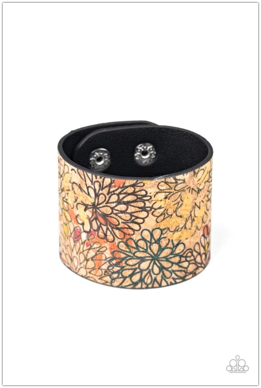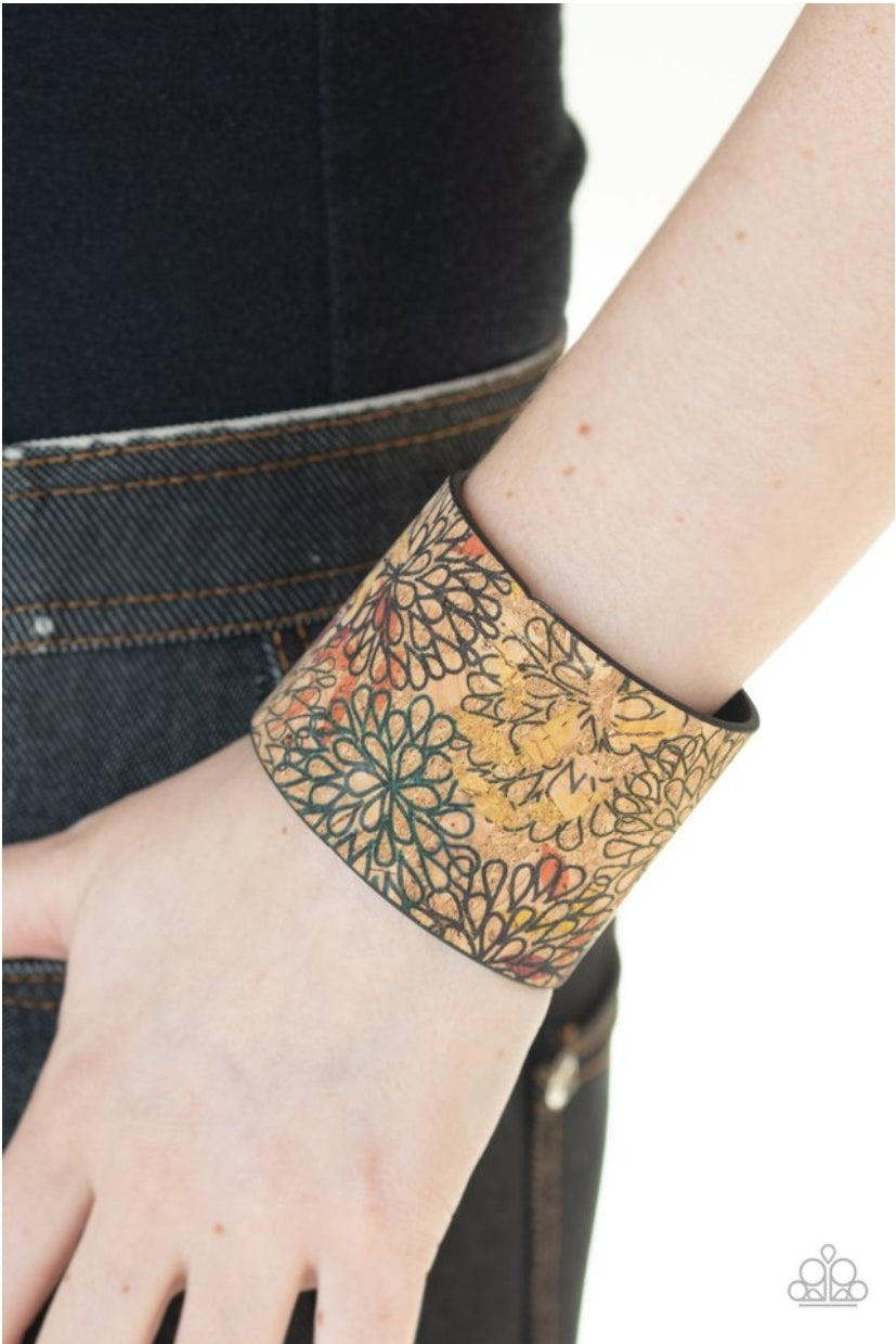 Painted in a colorfully distressed floral pattern, a thick cork-like leather band wraps around the wrist for a statement-making look. Features an adjustable snap closure.