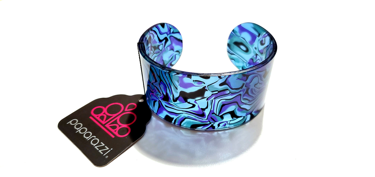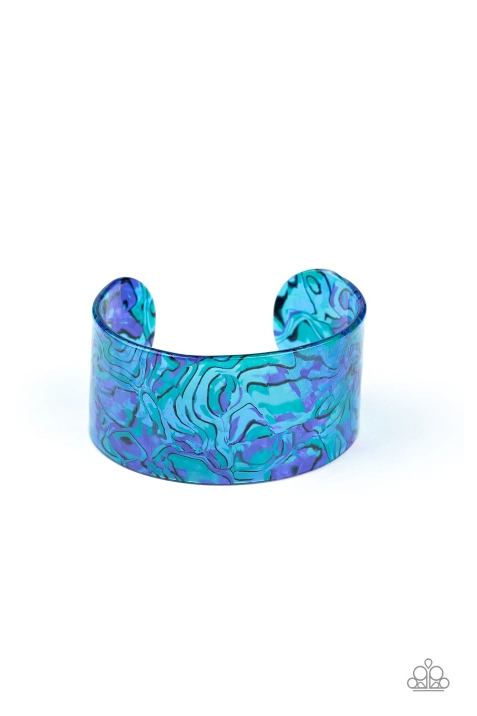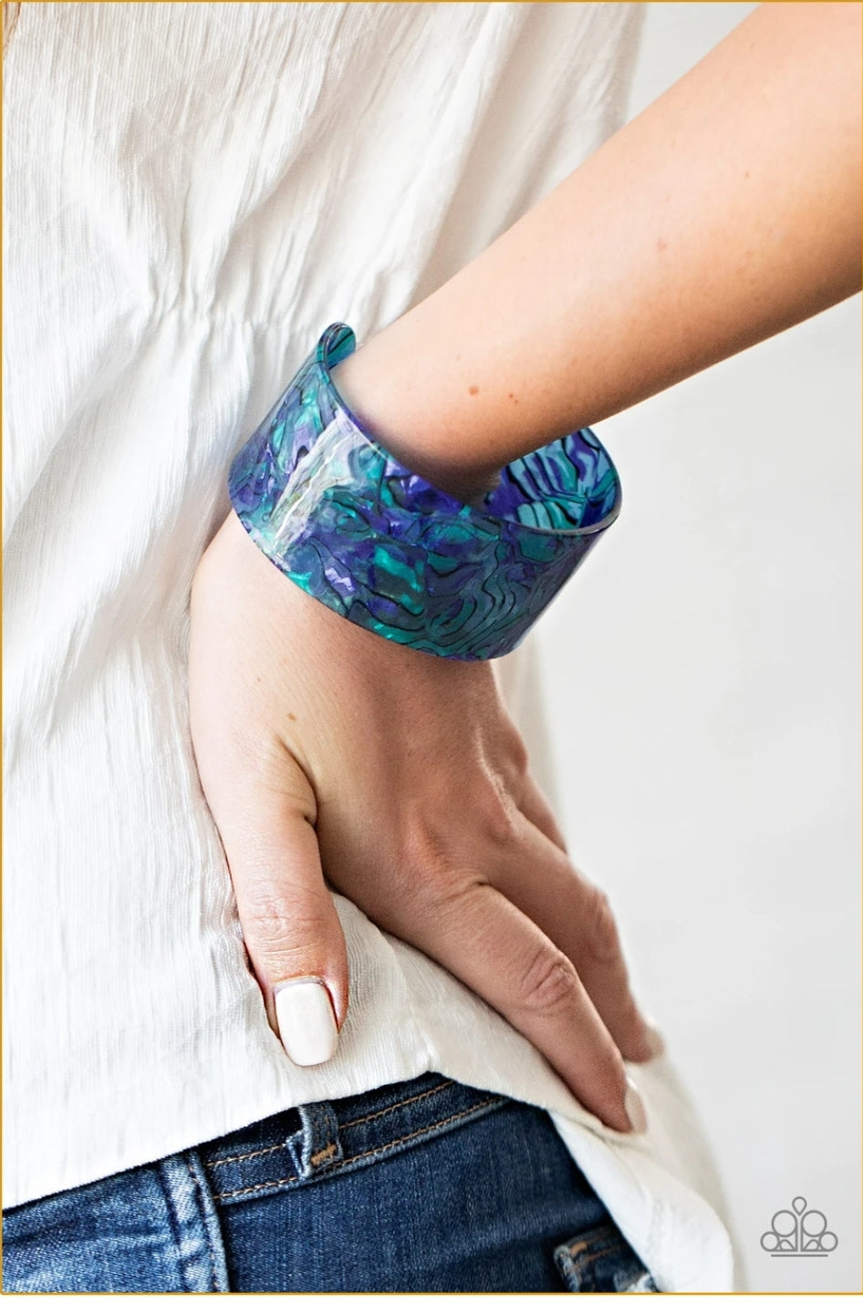 Featuring a retro watercolor pattern, a thick blue acrylic cuff curls around the wrist for an out-of-this-world colorful look.
