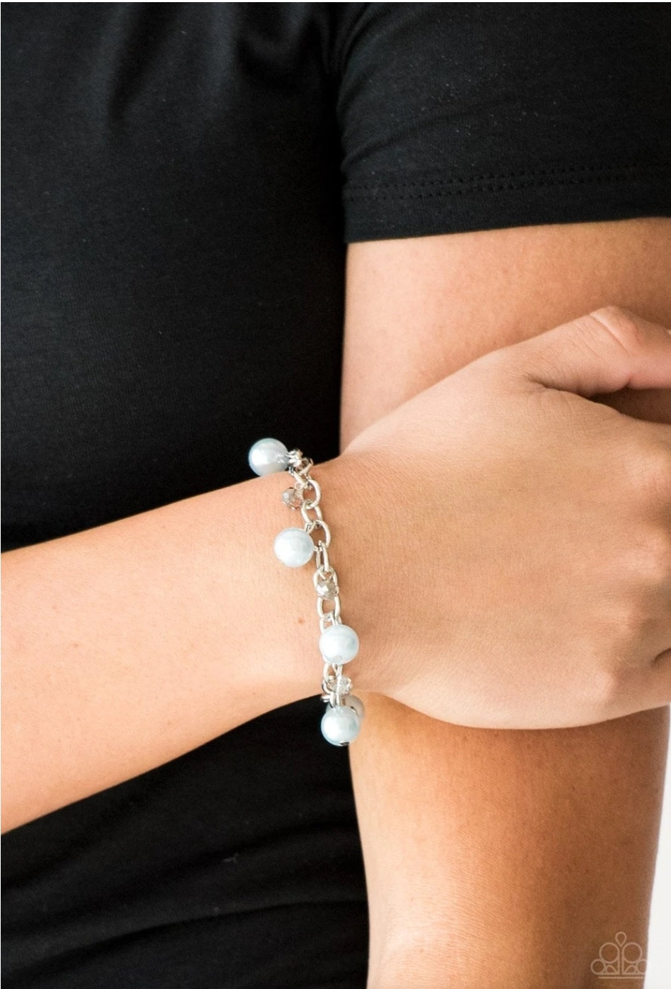 Classic blue pearls and smoky crystal-like beads dangle from a shimmery silver chain, creating a refined fringe around the wrist. Features an adjustable clasp closure.