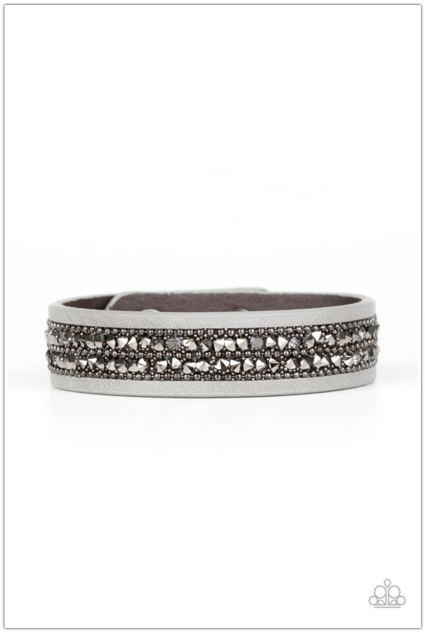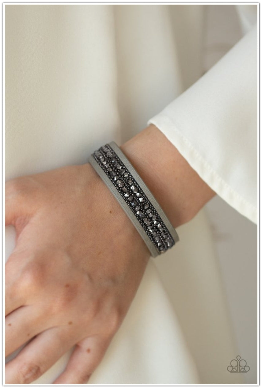 The center of a skinny gray leather band is encrusted in alternating rows of glistening gunmetal ball chains and glittery prism rhinestones for a sassy look. Features an adjustable snap closure.