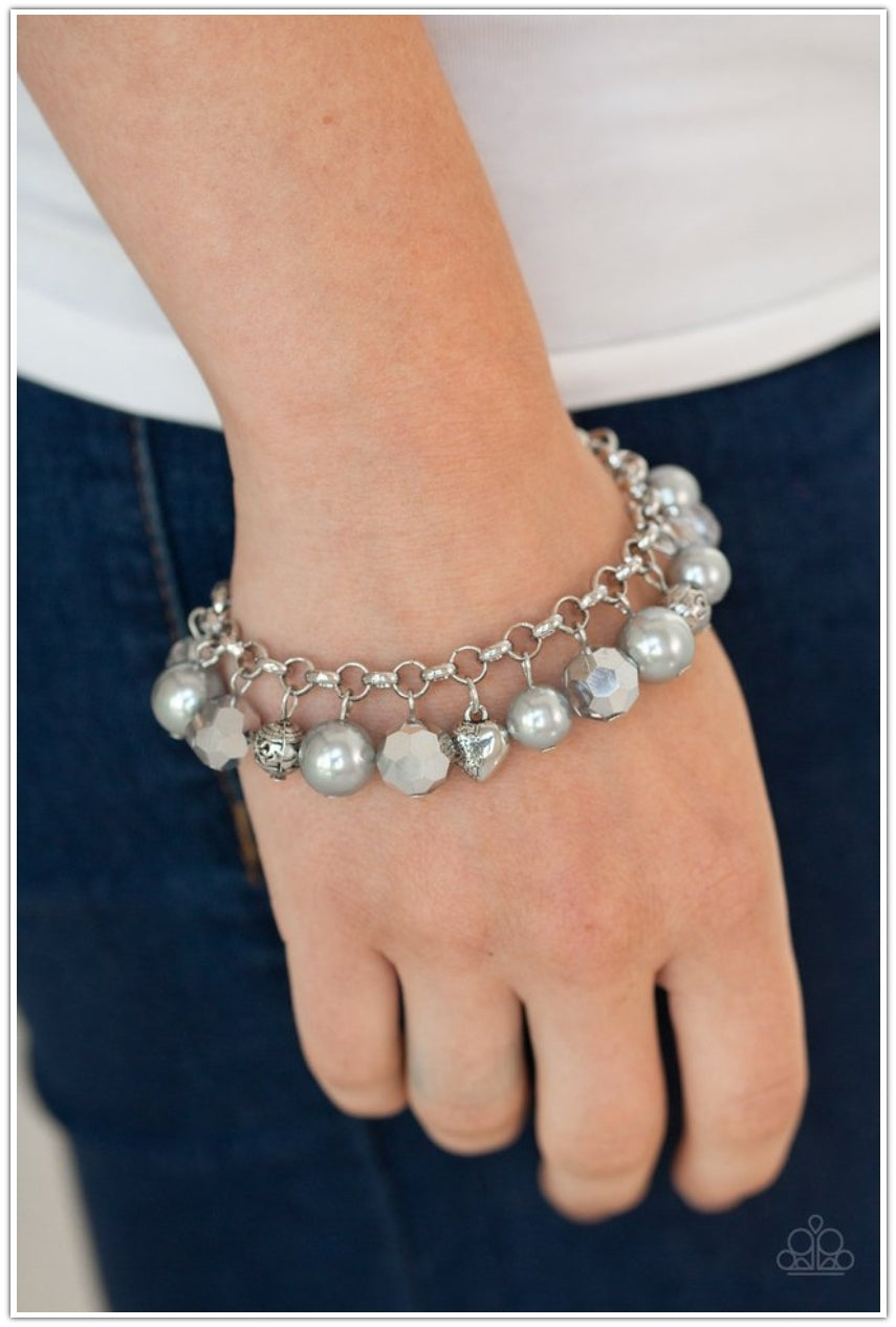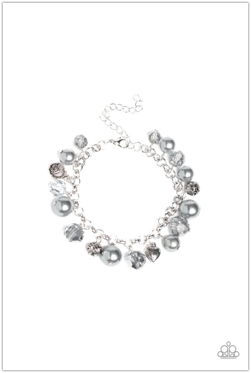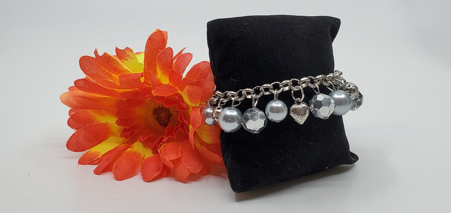 Featuring a dainty silver heart charm, rose charm, and ornate silver beads, a refined collection of silver pearls and metallic crystal-like beads swing from the wrist for a flirtatious flair. Features an adjustable clasp closure.