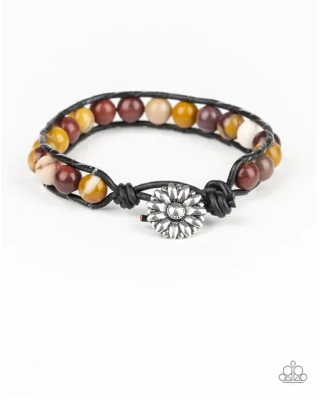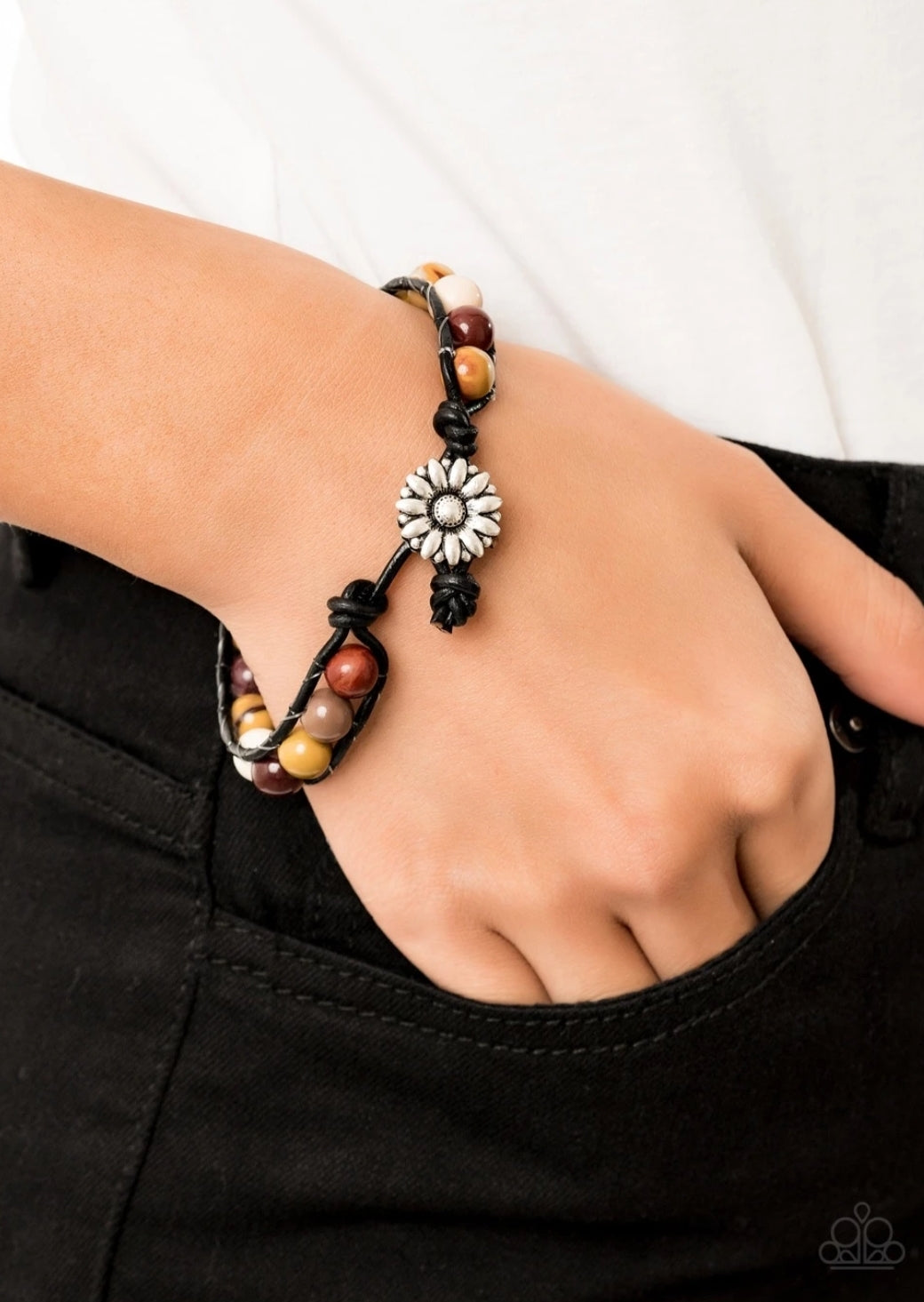 Featuring a silver floral fitting, a collection of refreshing stones are threaded between two strands of black cording around the wrist for a seasonal flair. Features a button loop closure.