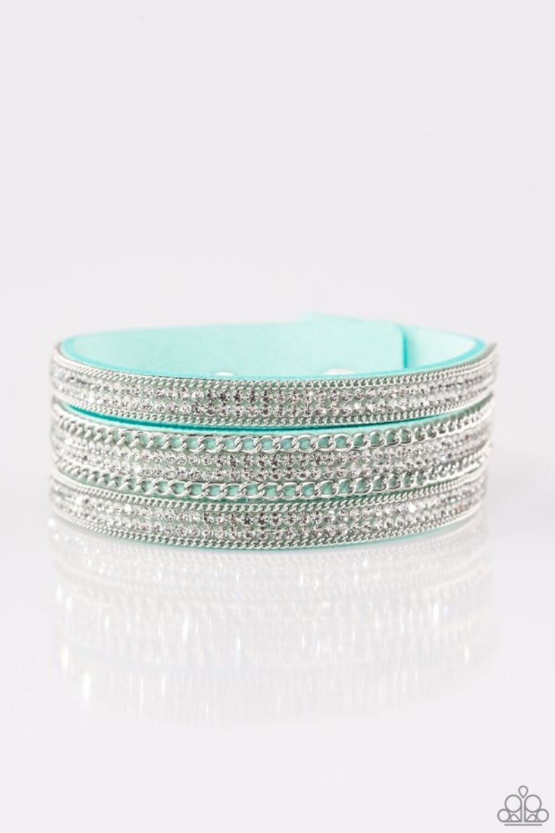 Rows of shimmery silver chains and glassy white rhinestones are encrusted along a blue suede band. The glittery band has been spliced into three strands, creating row after row of blinding shimmer for a sassy look. Features an adjustable snap closure.