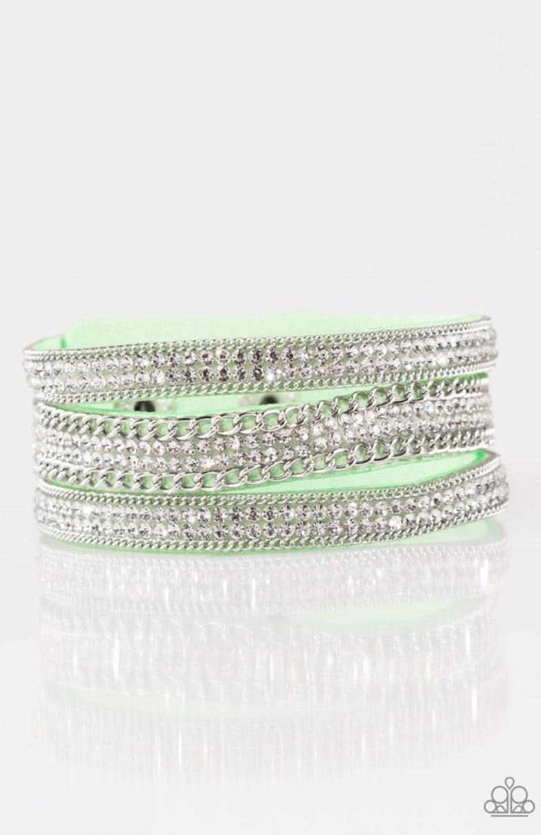 Rows of shimmery silver chains and glassy white rhinestones are encrusted along a green suede band. The glittery band has been spliced into three strands, creating row after row of blinding shimmer for a sassy look. Features an adjustable snap closure.