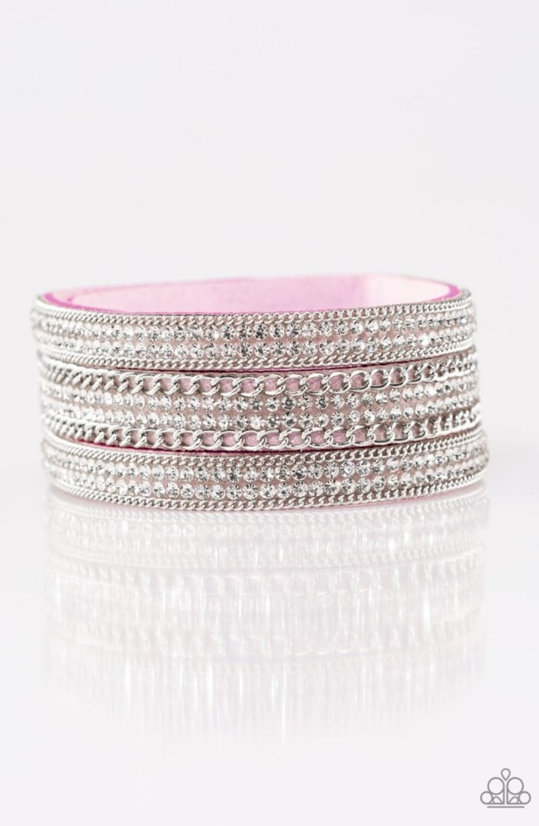 Rows of shimmery silver chains and glassy white rhinestones are encrusted along a purple suede band. The glittery band has been spliced into three strands, creating row after row of blinding shimmer for a sassy look. Features an adjustable snap closure.