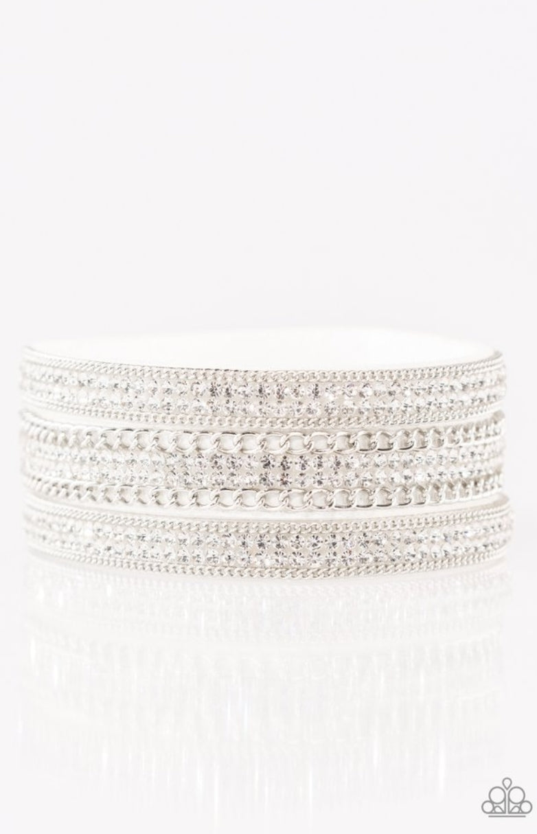 Rows of shimmery silver chains and glassy white rhinestones are encrusted along a white suede band. The glittery band has been spliced into three strands, creating row after row of blinding shimmer for a sassy look. Features an adjustable snap closure.