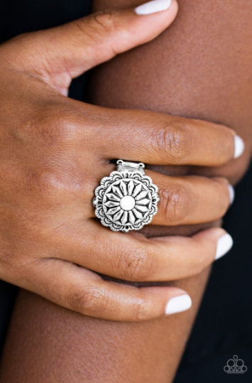 A polished white bead is pressed into a glistening silver frame radiating into a floral detail for a seasonal look. Features a stretchy band for a flexible fit.