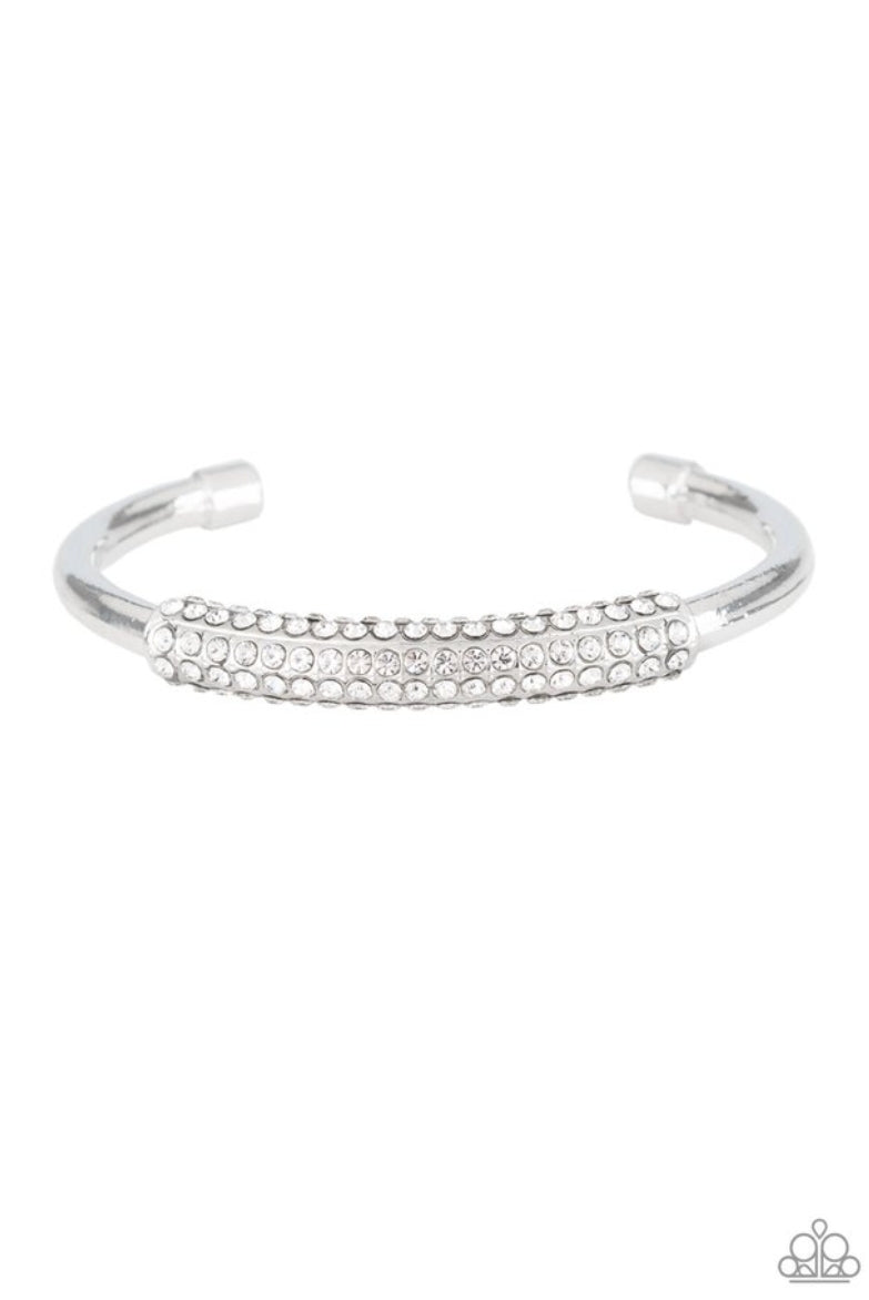 The center of a thick bangle-like cuff is decorated in a sleek silver frame encrusted in row after row of glassy white rhinestones for a refined flair.