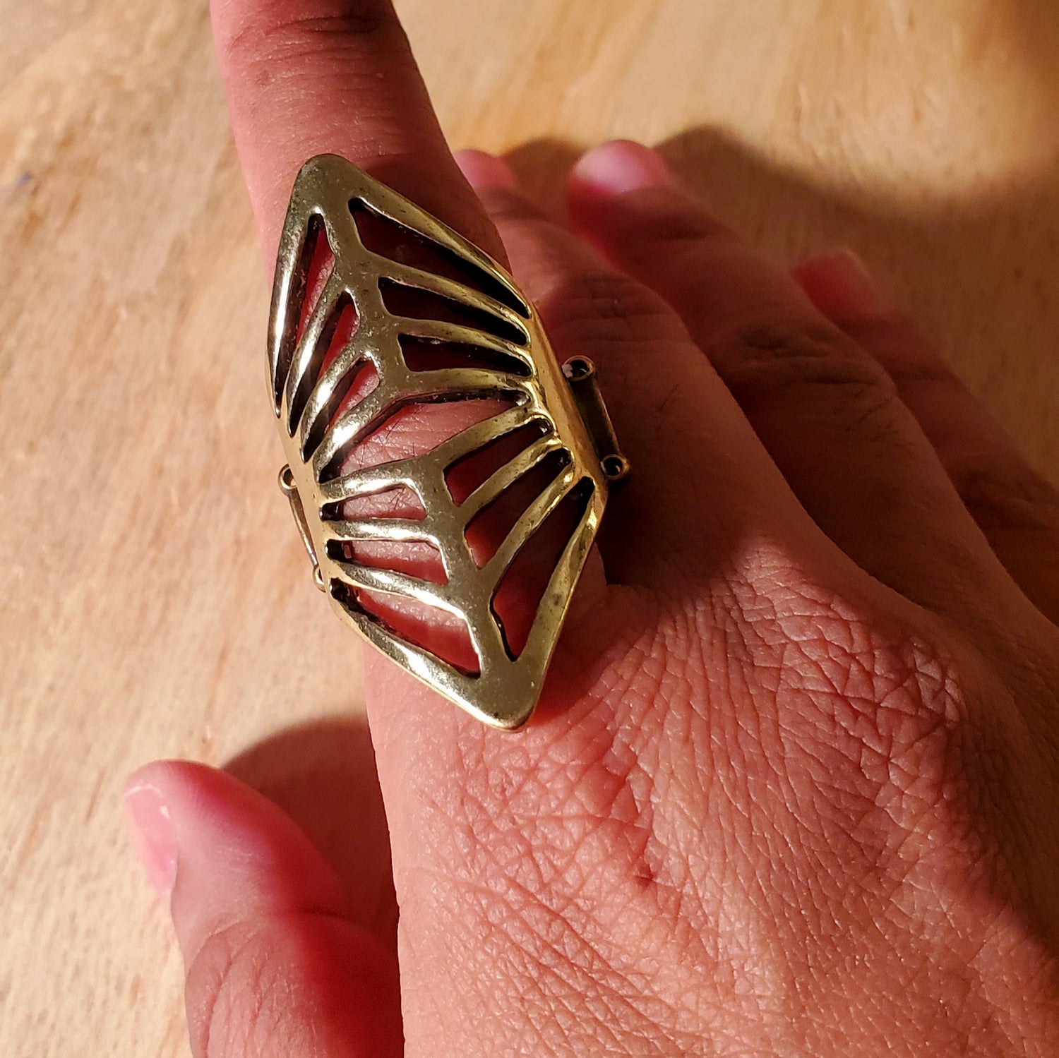 Glistening brass bars arc across the finger, coalescing into a bold centerpiece. Features a stretchy band for a flexible fit.