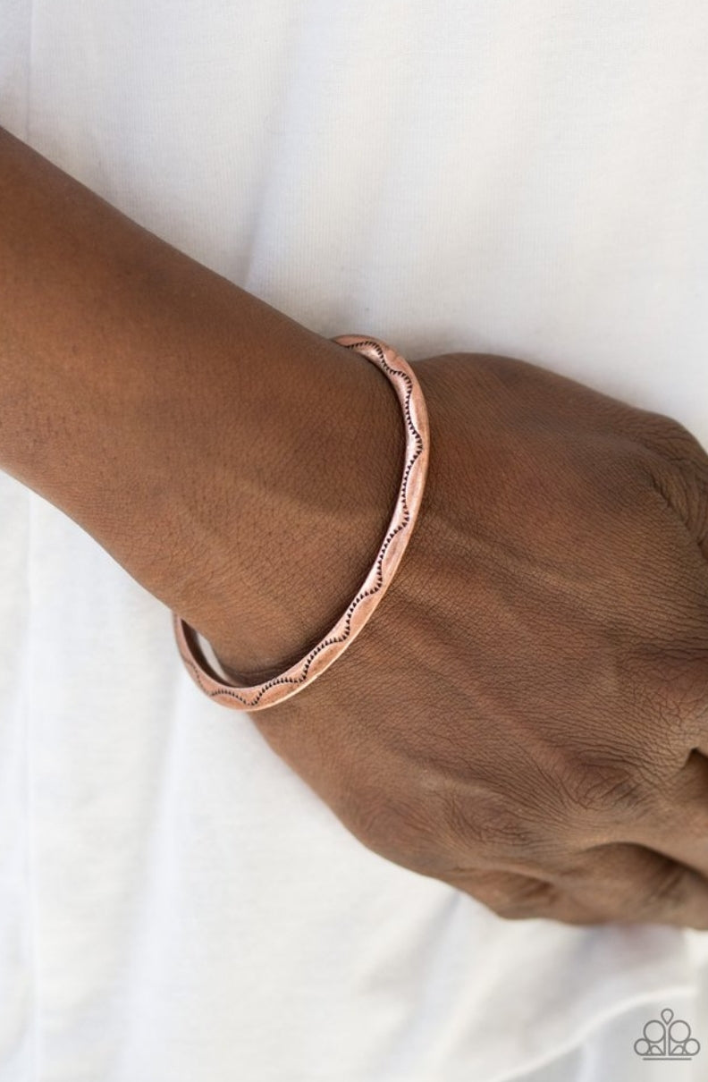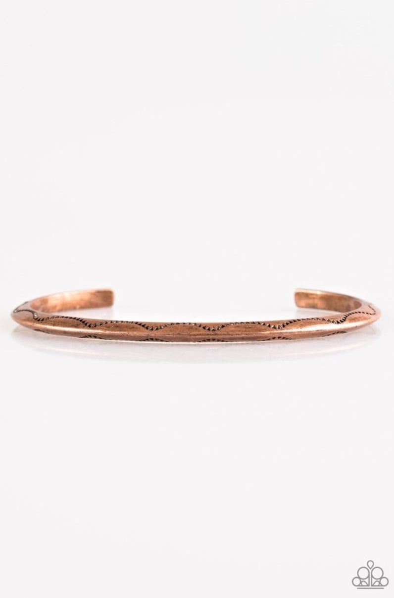 Stamped in a scalloped pattern, a glistening copper cuff wraps around the wrist for a tribal inspired look.