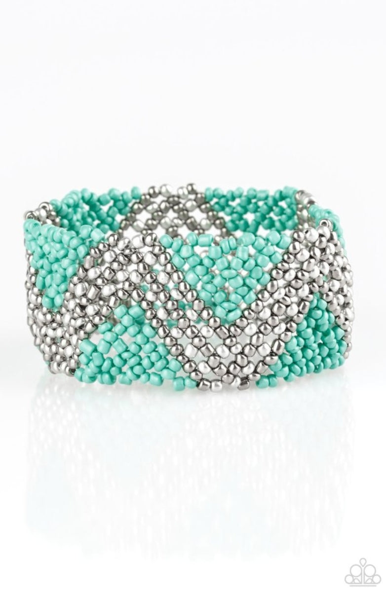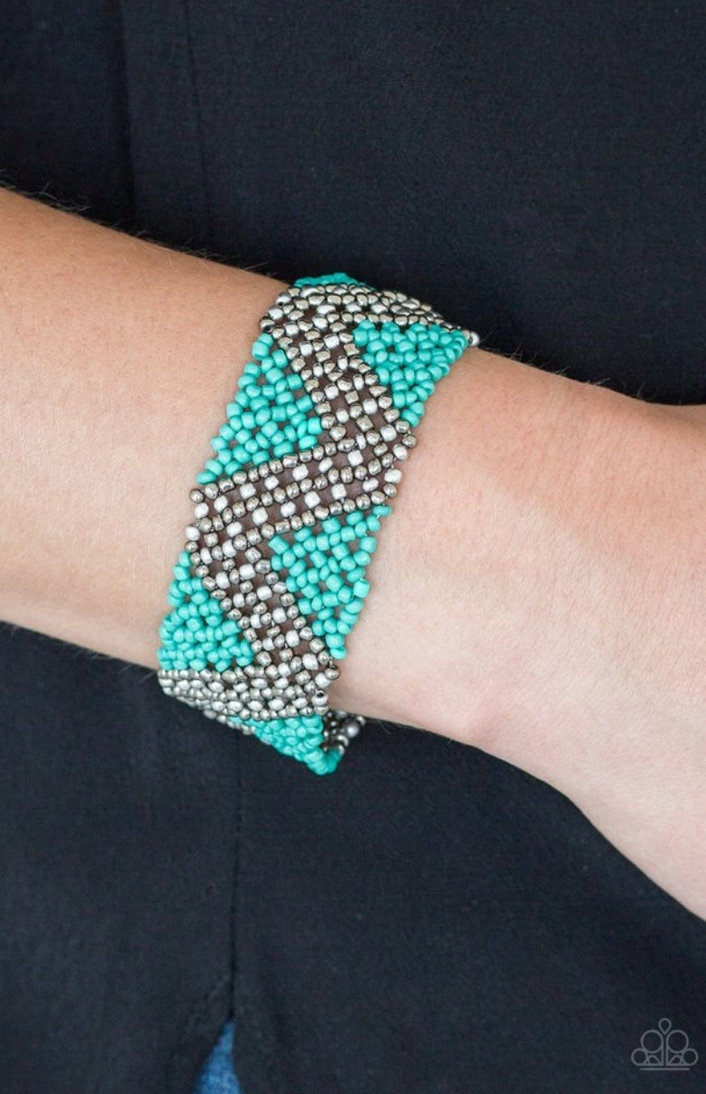 Imperfect turquoise, silver and gunmetal seed beads are threaded along elastic stretchy bands, creating a tribal inspired textile pattern around the wrist.
