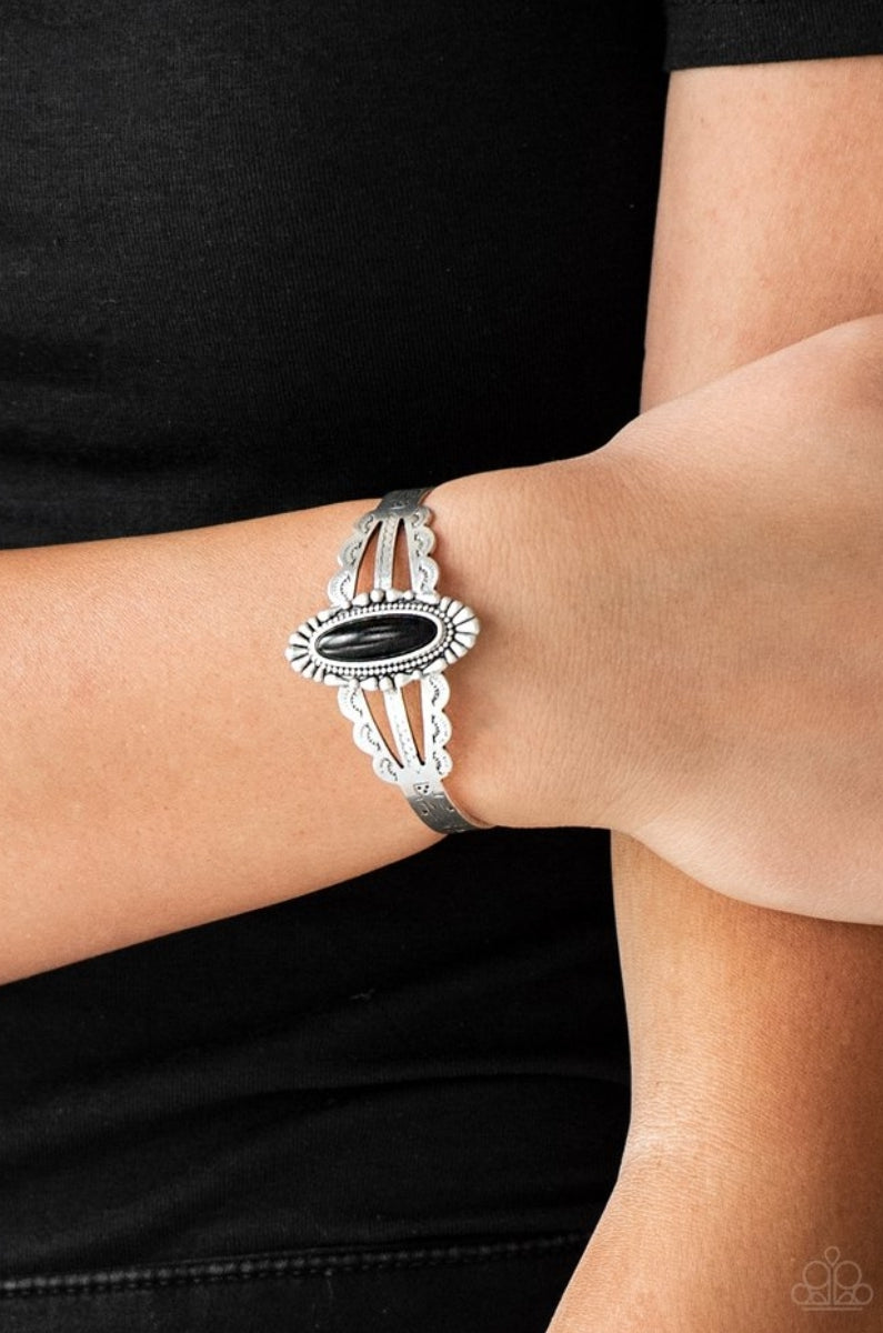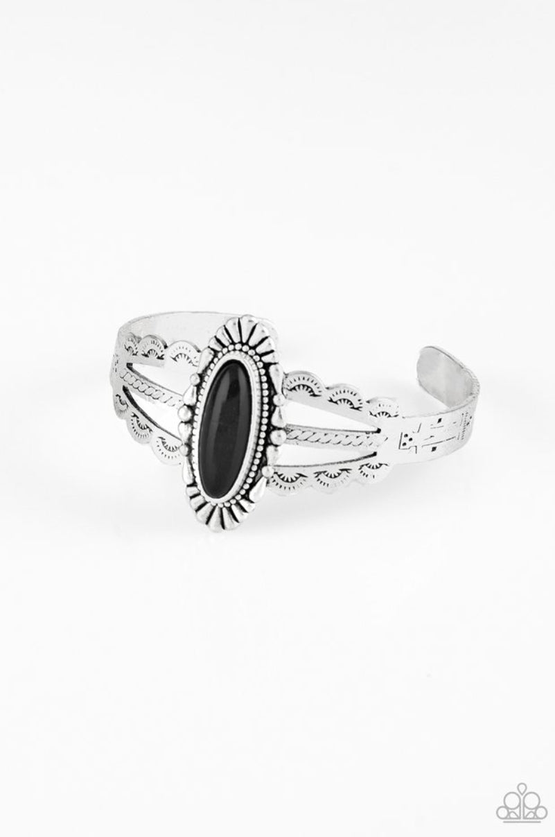 Stamped in tribal inspired patterns, a scalloped silver cuff curls around the wrist. A refreshing black stone is pressed into the center of the cuff, creating a whimsical centerpiece.