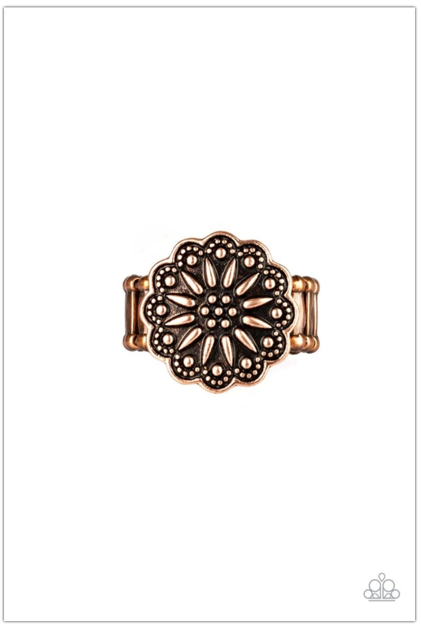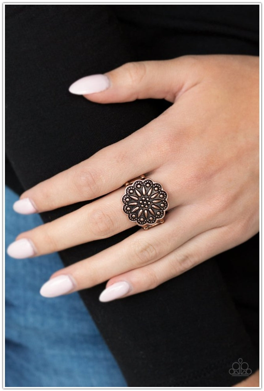 Embossed in a rustic wildflower pattern, a copper floral frame dots the top of the finger for a whimsical look. Features a stretchy band for a flexible fit.
