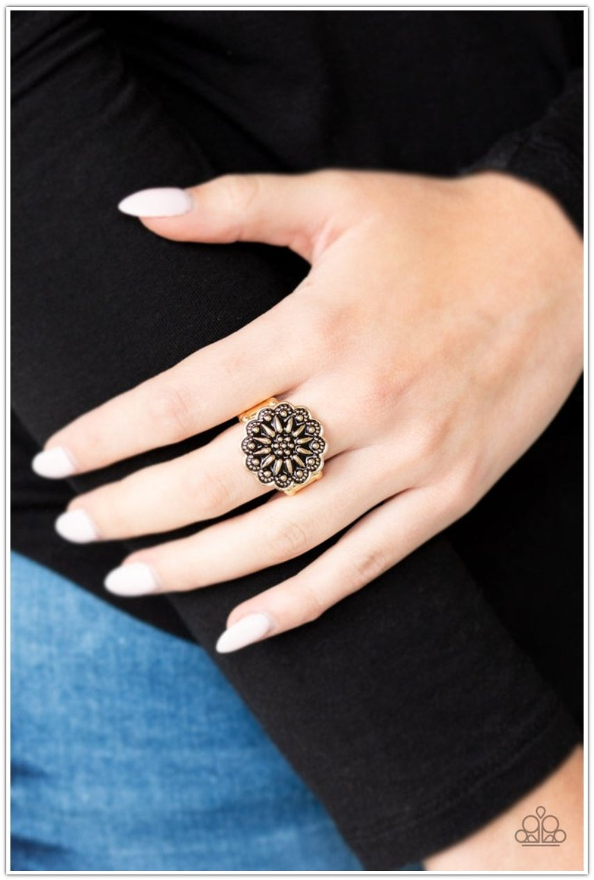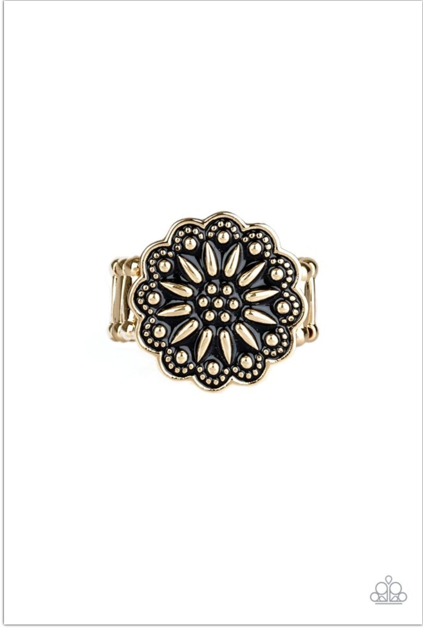 Embossed in a rustic wildflower pattern, a gold floral frame dots the top of the finger for a whimsical look. Features a stretchy band for a flexible fit.