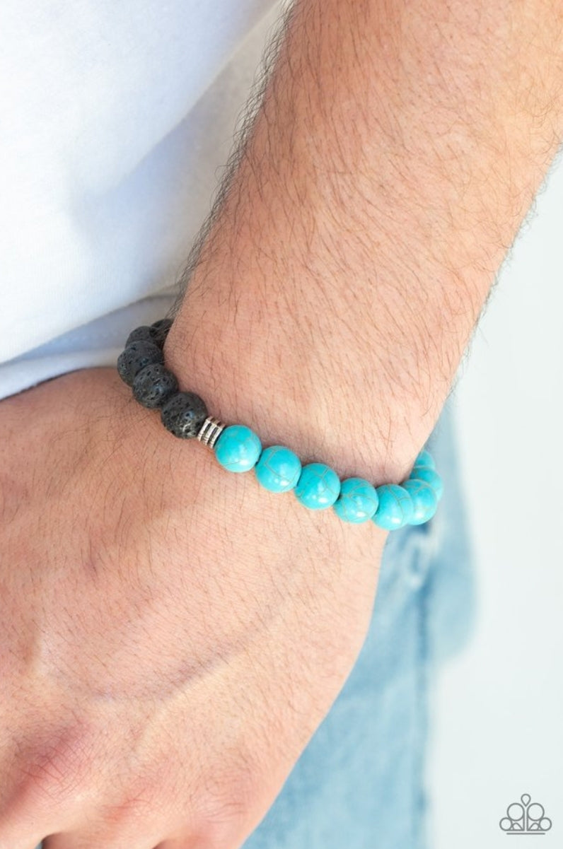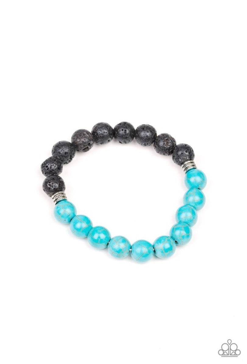 A collection of dainty silver accents, black lava rock beads, and refreshing turquoise stones are threaded along a stretchy band around the wrist for a seasonal style.