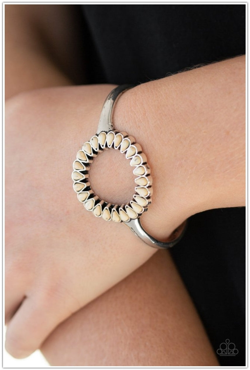 Chiseled into tranquil teardrops, refreshing white stones spin around the center of an antiqued silver cuff for a seasonal look.