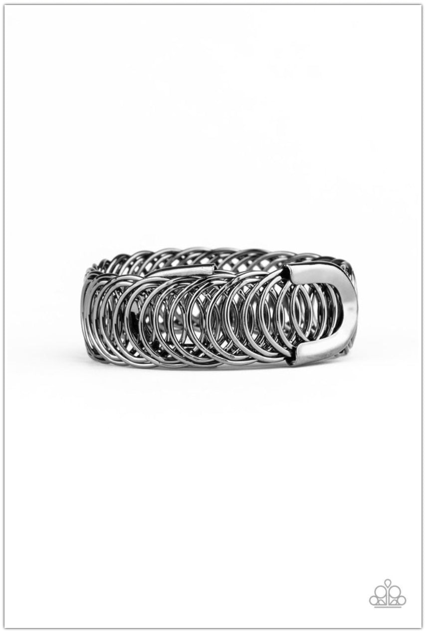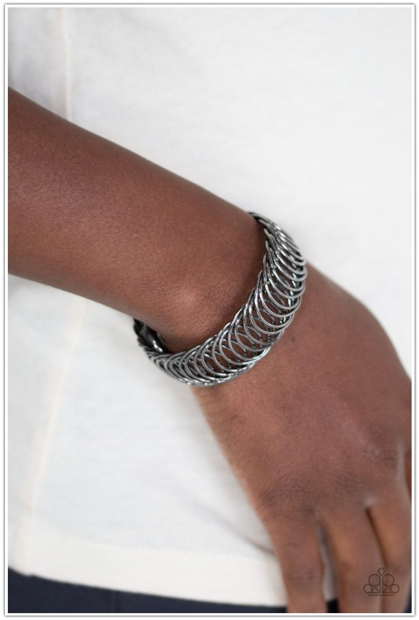 Glistening gunmetal rings overlap around the wrist, coalescing into a flexible cuff.