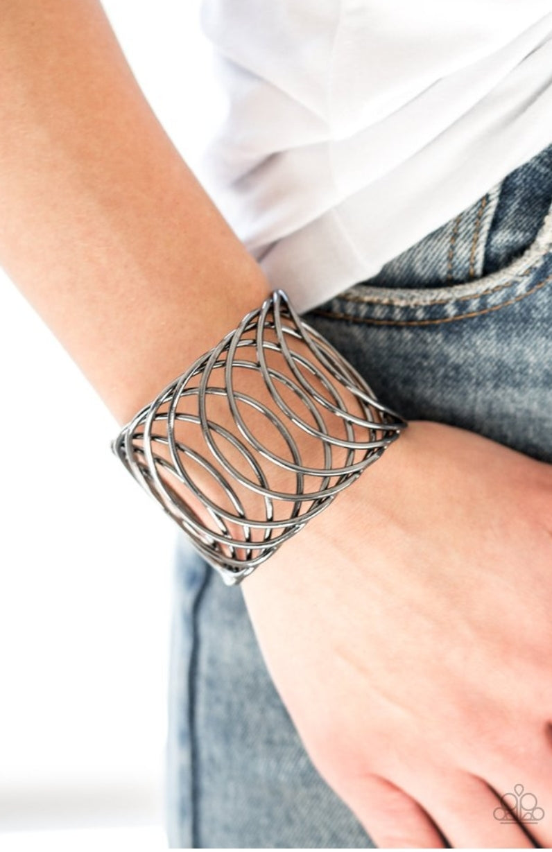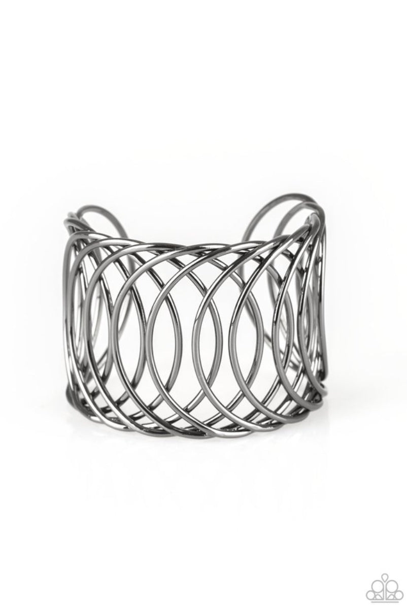 Overlapping gunmetal circular frames coalesce into a dizzying cuff for a classic look.